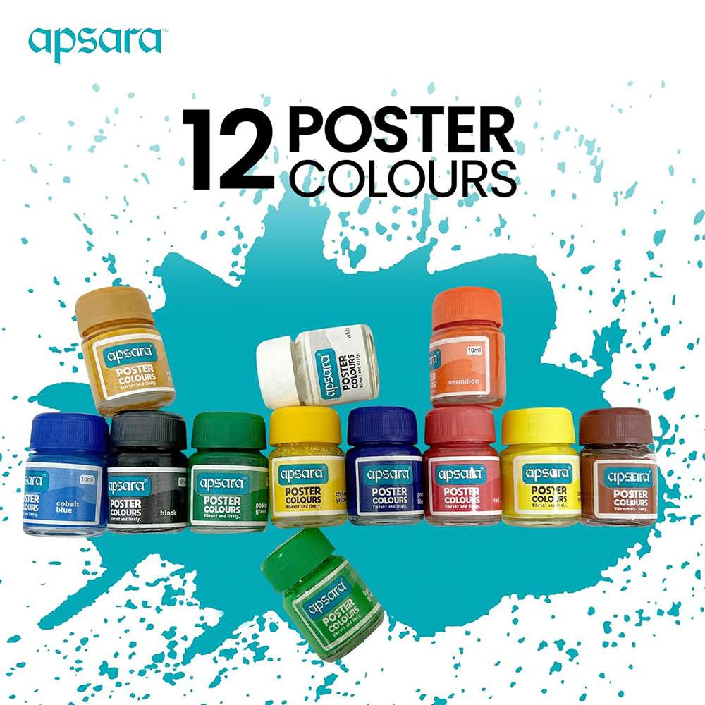 Apsara Poster Colours (Model APS109770001) offer 12 rich shades in a plastic box with a free palette. Designed for vibrant artwork, suitable for school, hobby, and creative projects.