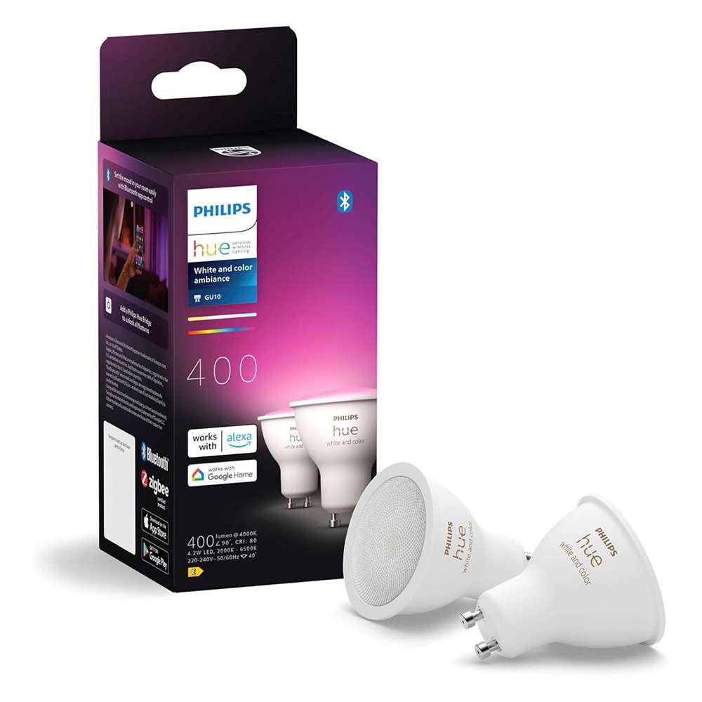 مصباح فيليبس هيو الذكي (GU10) استطاعة (4.2W) مع إضاءة محيطية بيضاء وملونة عبوة من قطعتين