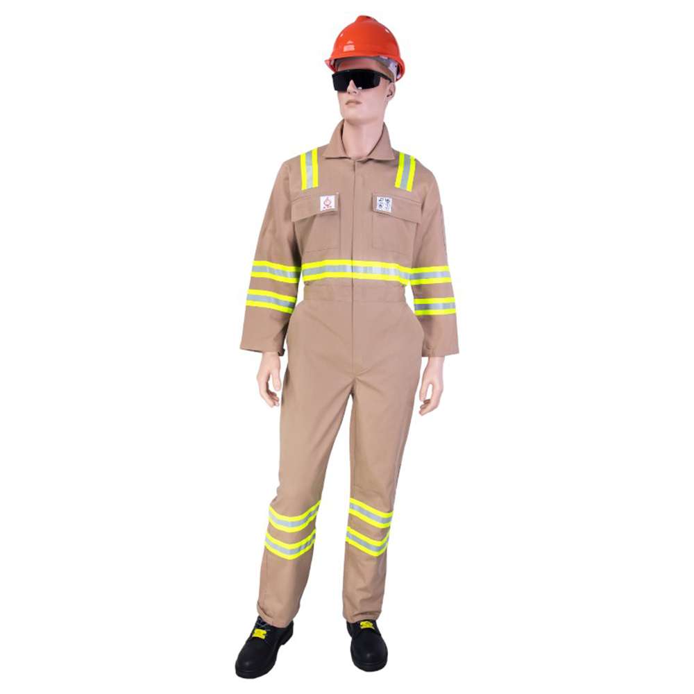 With 2 inches dual tone (grey/flourescent yellow) FR reflective tape, 11 reflective tapes, 4 reflective tapes on sleeves 4 reflective tapes on leg, 2 reflective tapes on shoulder, 1 reflective tape on waist, Sanforized / mercerized