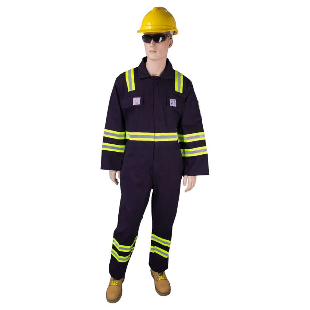 With 2 inches dual tone (grey/flourescent yellow) FR reflective tape, 11 reflective tapes, 4 reflective tapes on sleeves 4 reflective tapes on leg, 2 reflective tapes on shoulder, 1 reflective tape on waist, Sanforized / mercerized