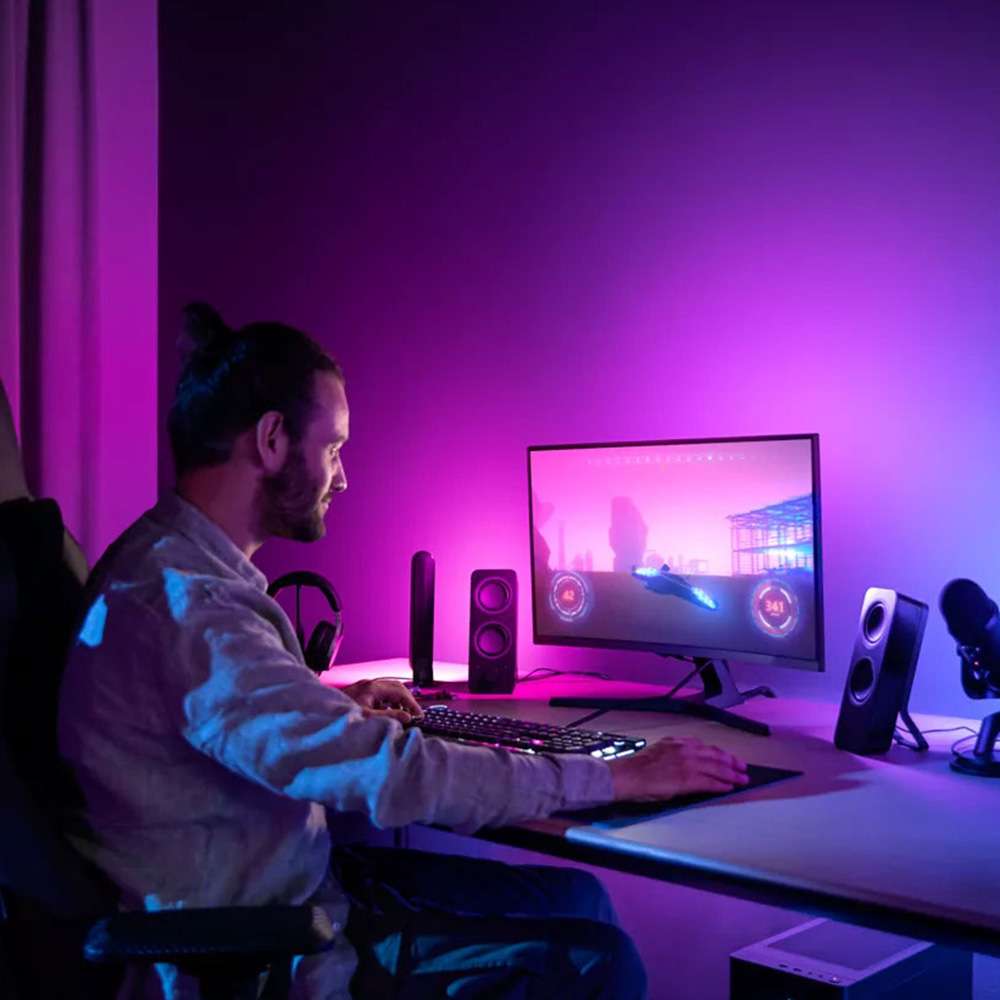 التزامن مع المحتوى: يستخدم تطبيق Hue Sync لسطح المكتب لعكس نشاط الشاشة، مُوفرًا تأثيرات إضاءة ديناميكية تتفاعل مع الألعاب والأفلام والموسيقى.