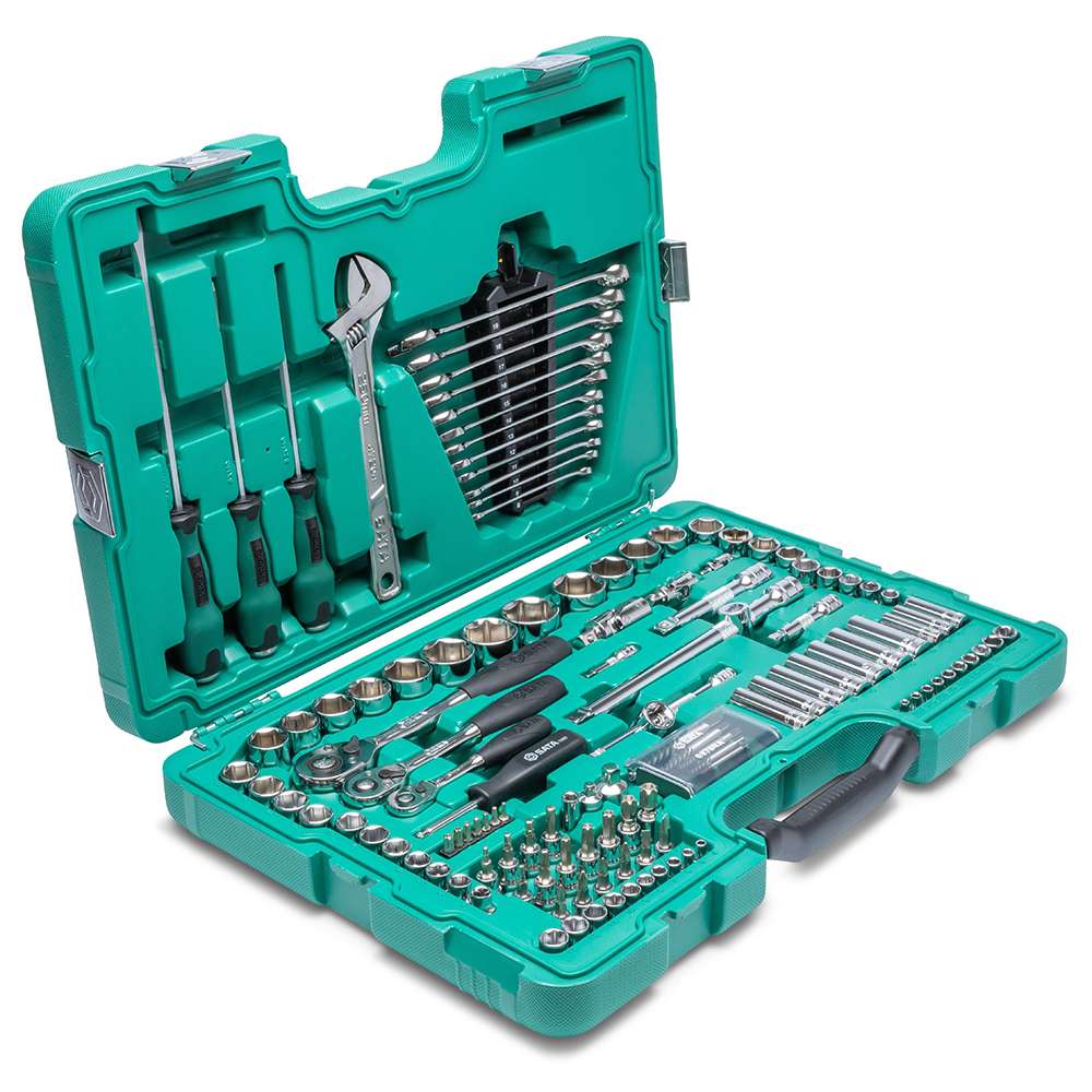 مجموعة مكونة من 124 قطعة: تتضمن مجموعة كبيرة من المقابس المترية ذات الست نقاط ومقابس SAE و محركات 1/4 بوصة و3/8 بوصة و1/2 بوصة، مما يوفر تغطية واسعة لمجموعة واسعة من أدوات الربط والتطبيقات.