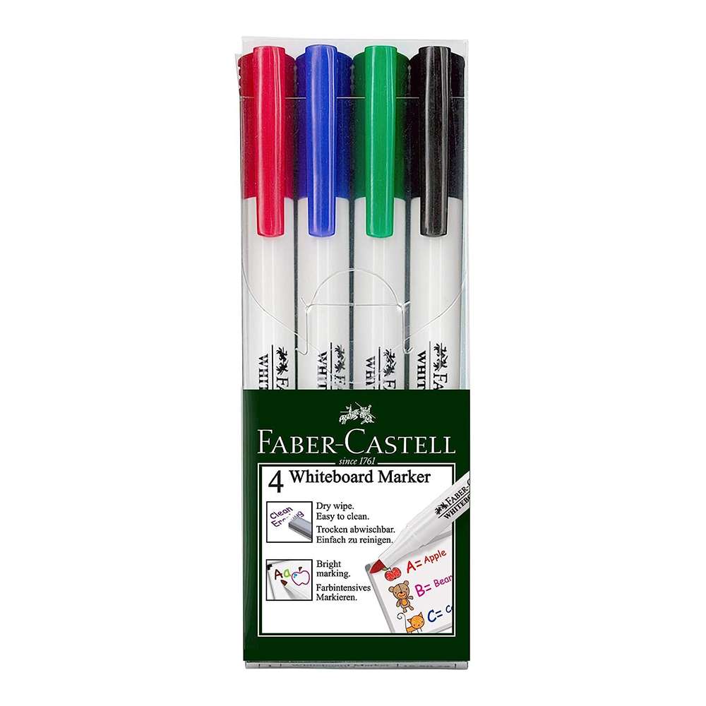 Faber-Castell White Board Marker, Slim Design, Bullet Tip, Low-Odour, Smooth Flow, Dry Wipe, Ideal for School & Office Use, Assorted Colors – Wallet of 4