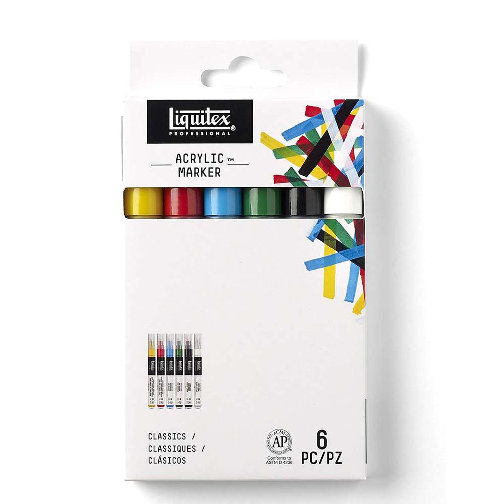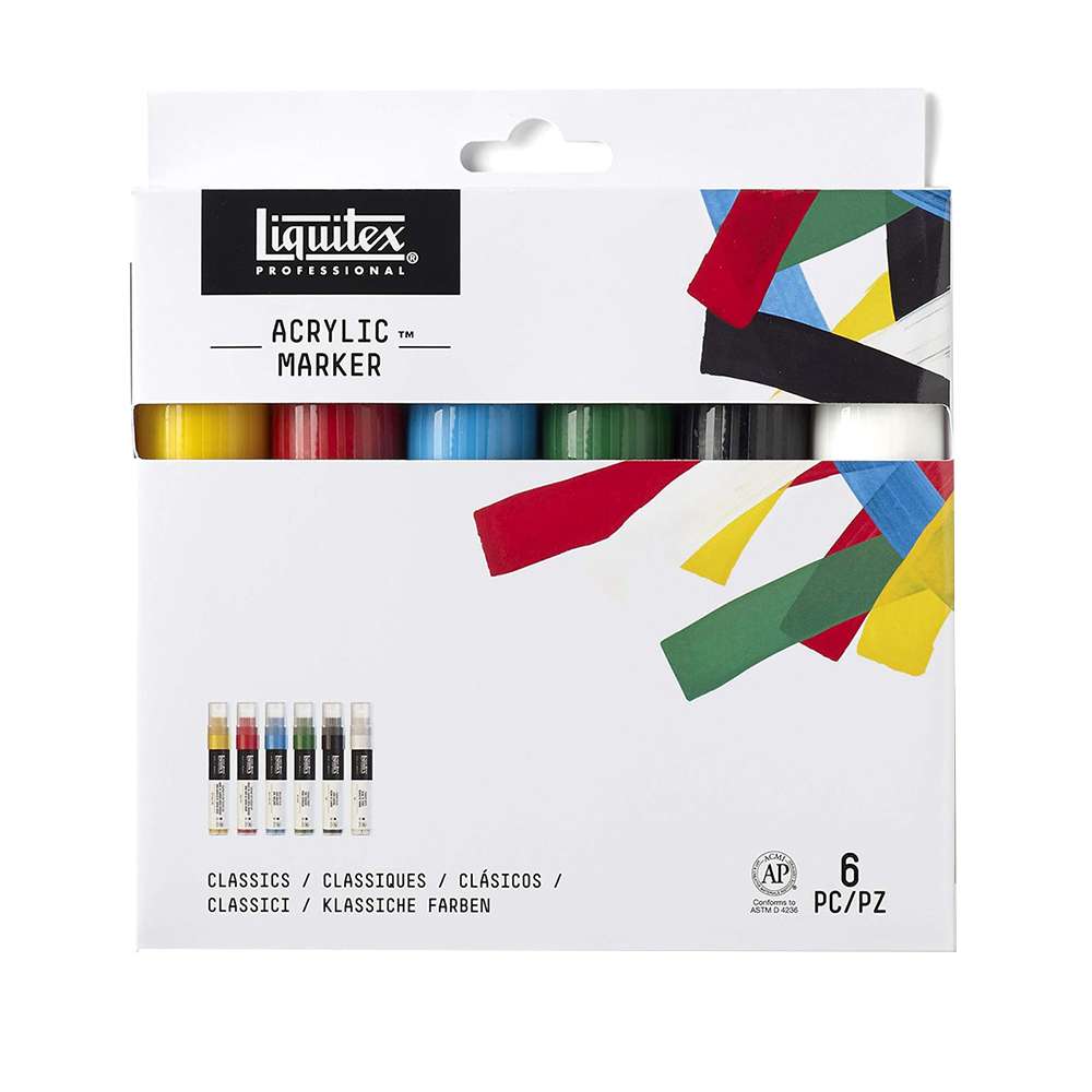 قلم تحديد طلاء احترافي من ليكويتكس، سن عريض، أكريليك مائي، مقاوم للضوء، درجات ألوان كلاسيكية، مناسب للفنانين المحترفين ضمن عبوة من (6) ألوان