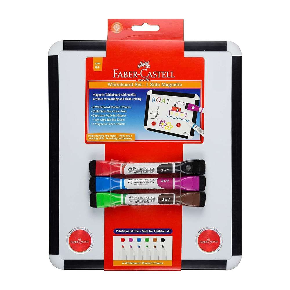 Faber-Castell Whiteboard Set with Markers, Dry Wipe, & Magnetic Paper Holders, Single-Sided Magnetic Board, Dry Wipe Eraser, Smooth Surface & Flow, Ideal for School & Office Use - Pack of 1 + 6 + 2