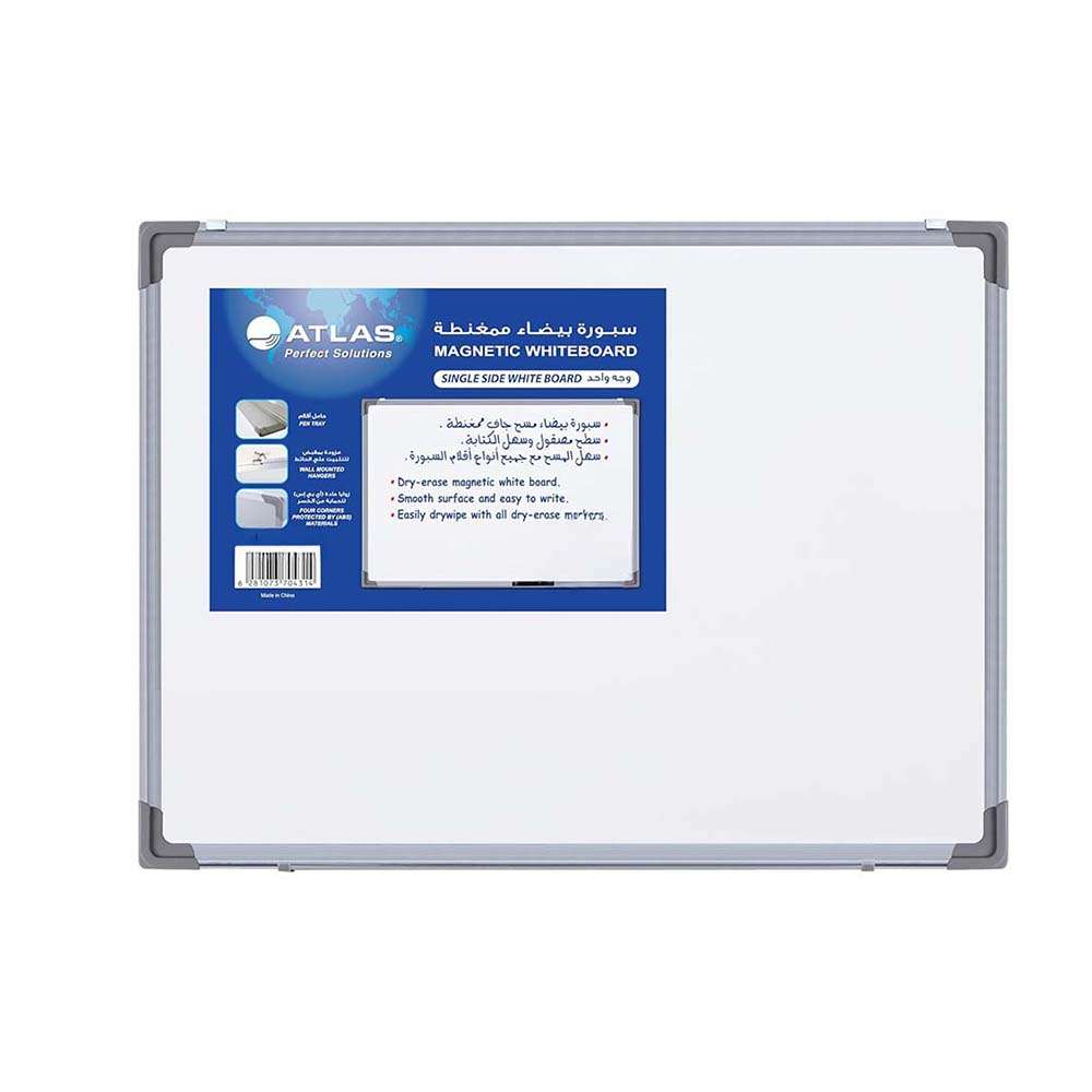 سبورة أطلس البيضاء، أحادية الجانب (120×240cm) ناعمة الكتابة والمسح، بإطار من الألومنيوم، تُثبّت على الحائط، مثالية للاستخدام في المدارس والمكاتب والمنازل لون أبيض