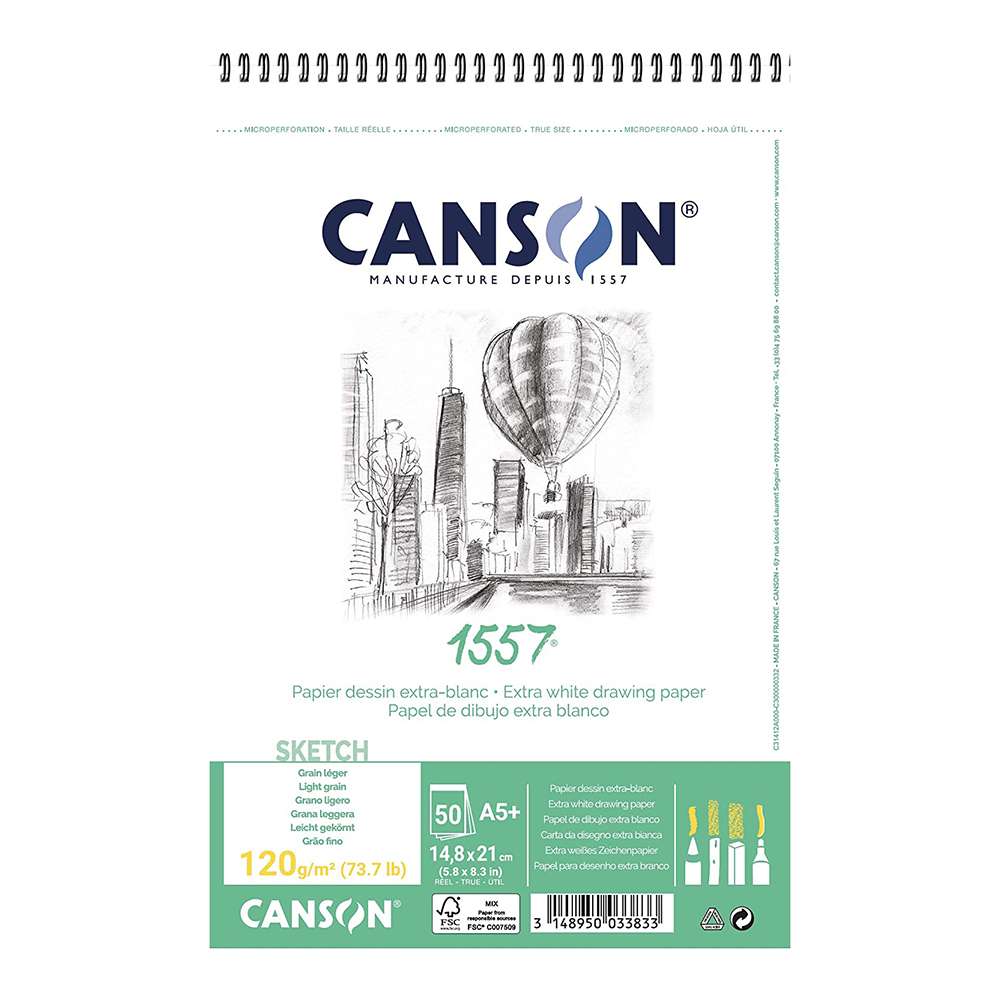 Canson 1557 A5 Sketch Pad (120gsm) is a compact, spiral-bound pad offering smooth fine-grain paper for sketching and linework. Ideal for travel and quick drawings.