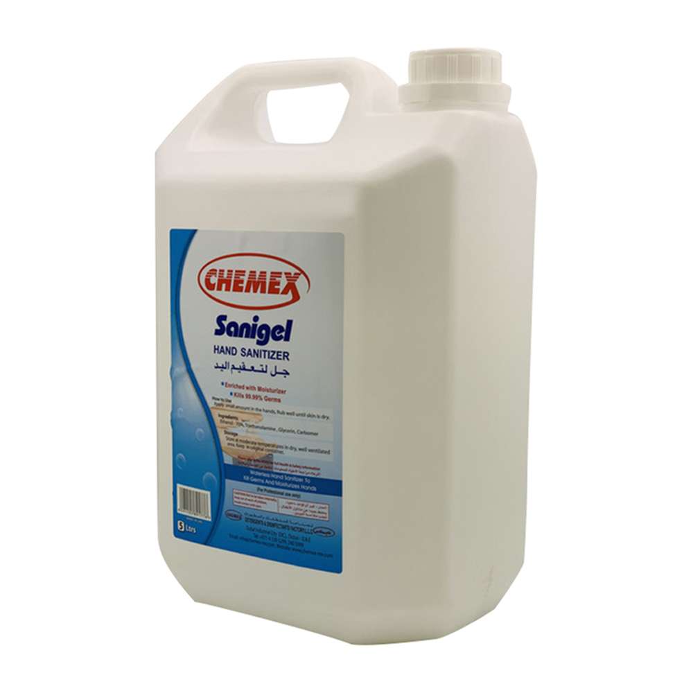 • Large pack of Chemex hand sanitizing gel for multiple uses.1. Chemex Sanigel Hand Sanitizing Gel is a premium-quality product designed for effective hand hygiene, packaged conveniently in a 5L container with 4Pcs per Pack for extended use.