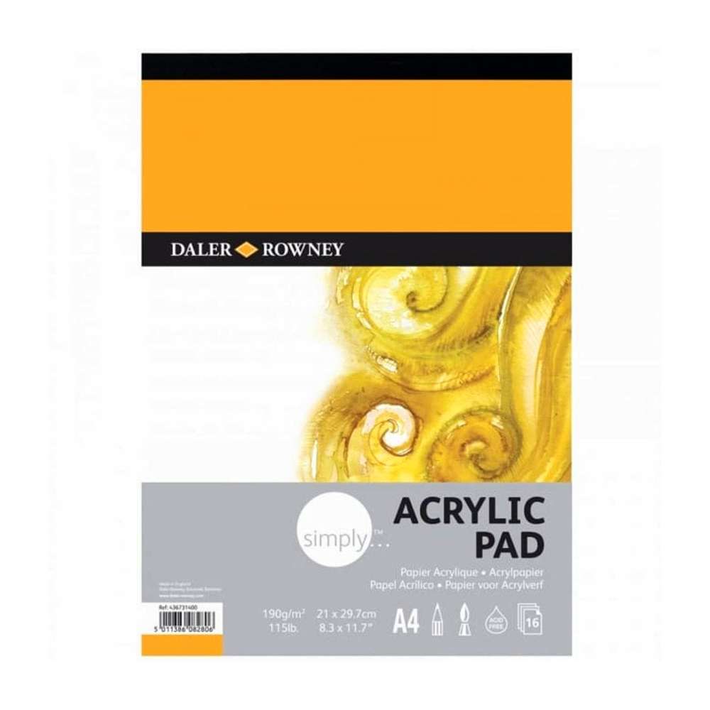 Daler Rowney Simply Acrylic Pad A4 (190gsm) features textured acid-free paper suitable for acrylic paints. Its absorbent surface provides excellent pigment retention and layering control.