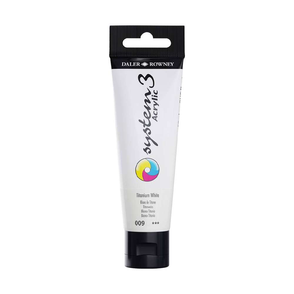 The Daler Rowney System 3 Acrylic Titanium White 59ml (Model: DAL129059009) offers excellent opacity and a smooth finish for highlighting, base coating, and colour mixing.