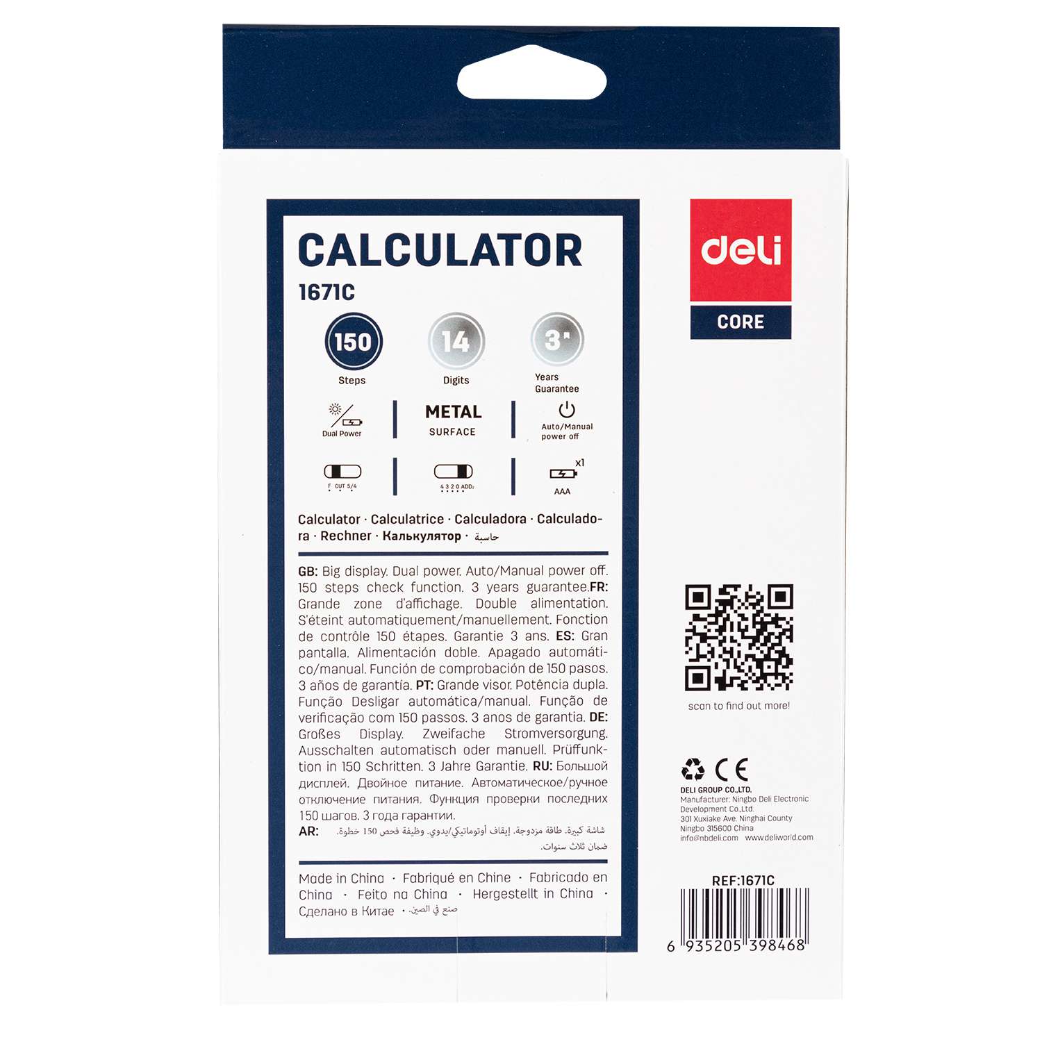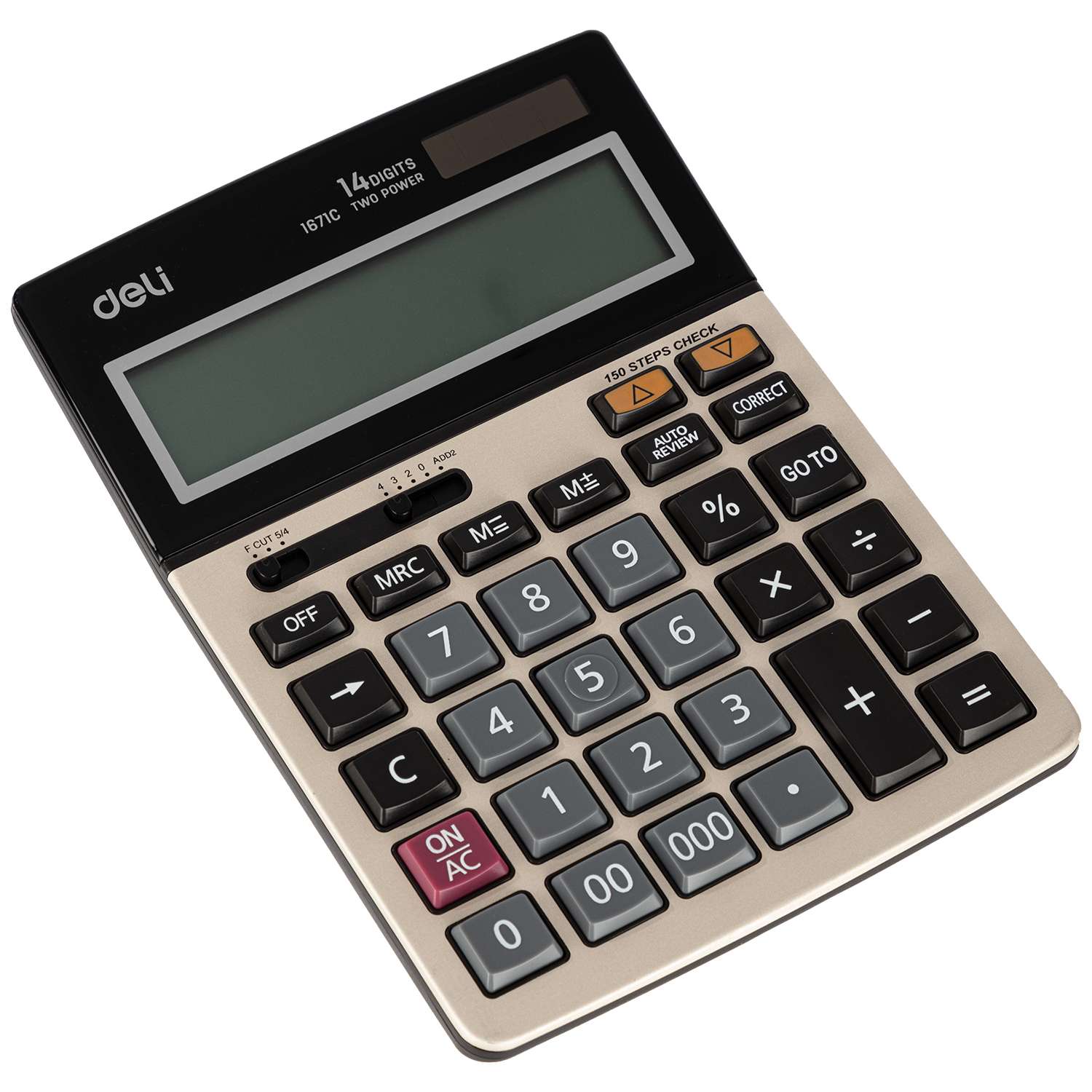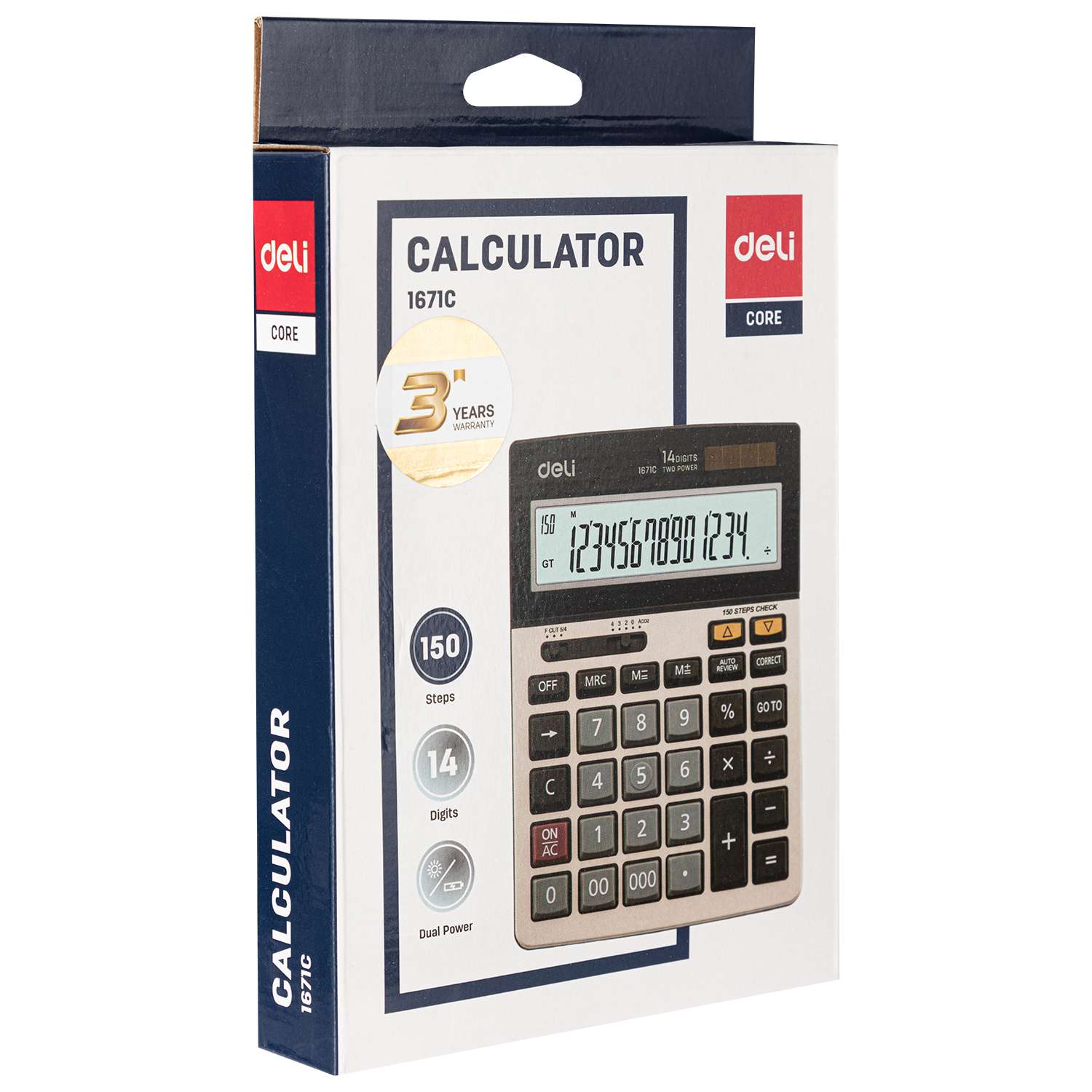 Deli offers large-capacity calculating for offices, classrooms, and shops. Engineered for legibility, model E1671C provides a 14-digit extra-wide display and a comfortable keypad. Business-friendly functions and angled viewing help with summaries, reconciliations, and quick checks throughout busy days.
