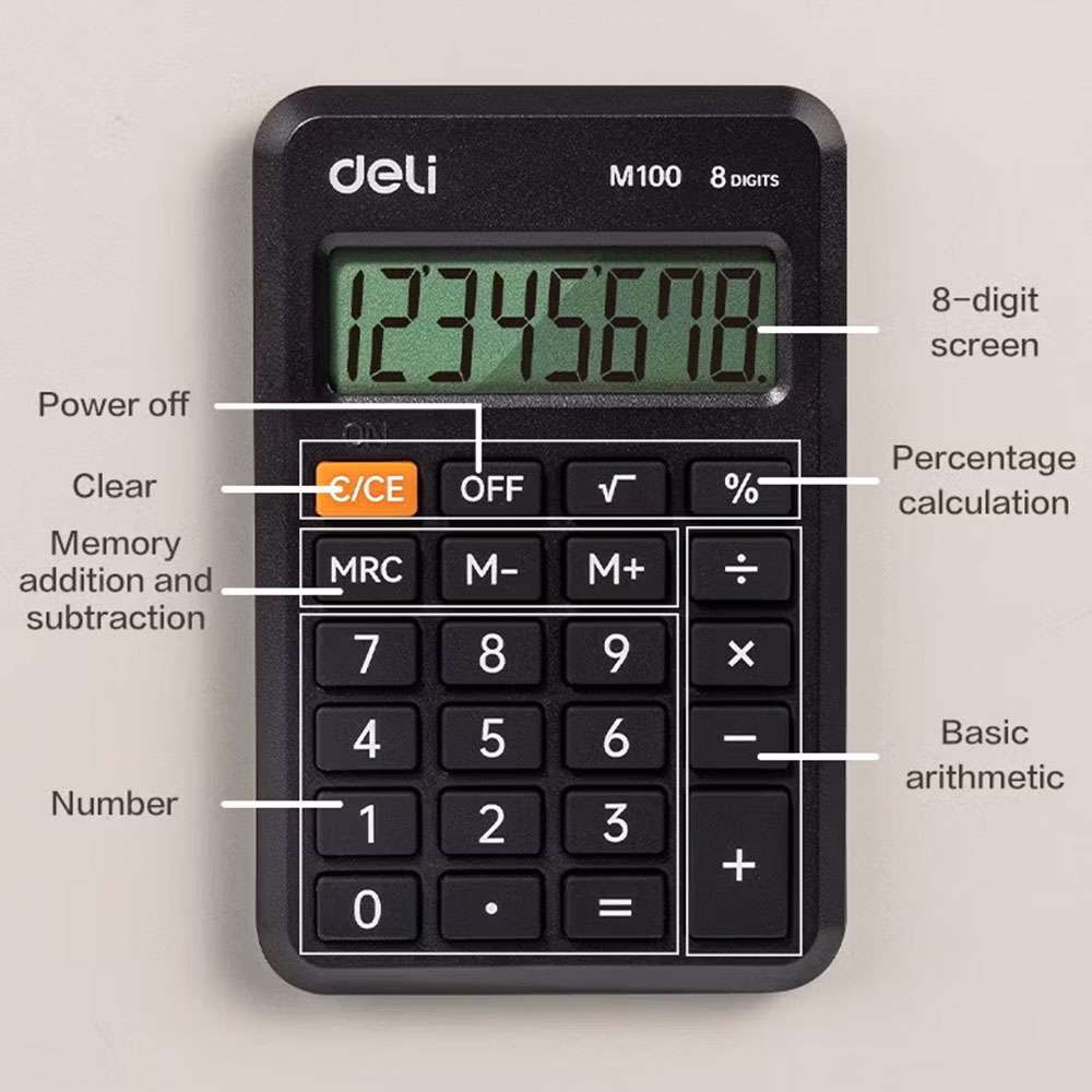 Deli provides a compact pocket calculator for travel, exams, and quick estimates. The focus is on an easy-to-read 8-digit display, responsive keys, and a protective cover, helping users calculate confidently with the EM100 in classrooms, shops, and daily errands.