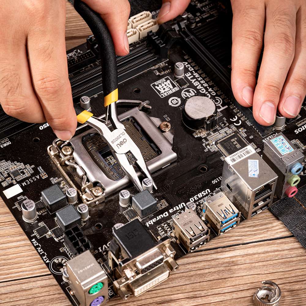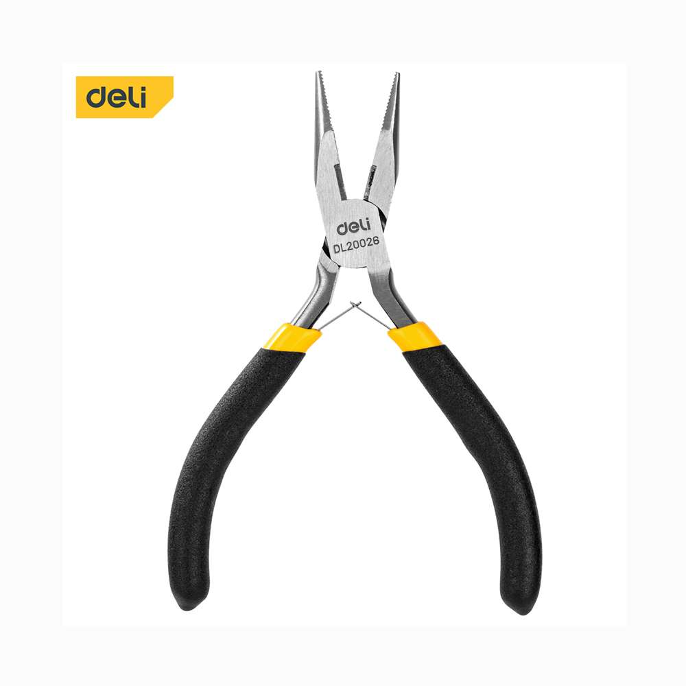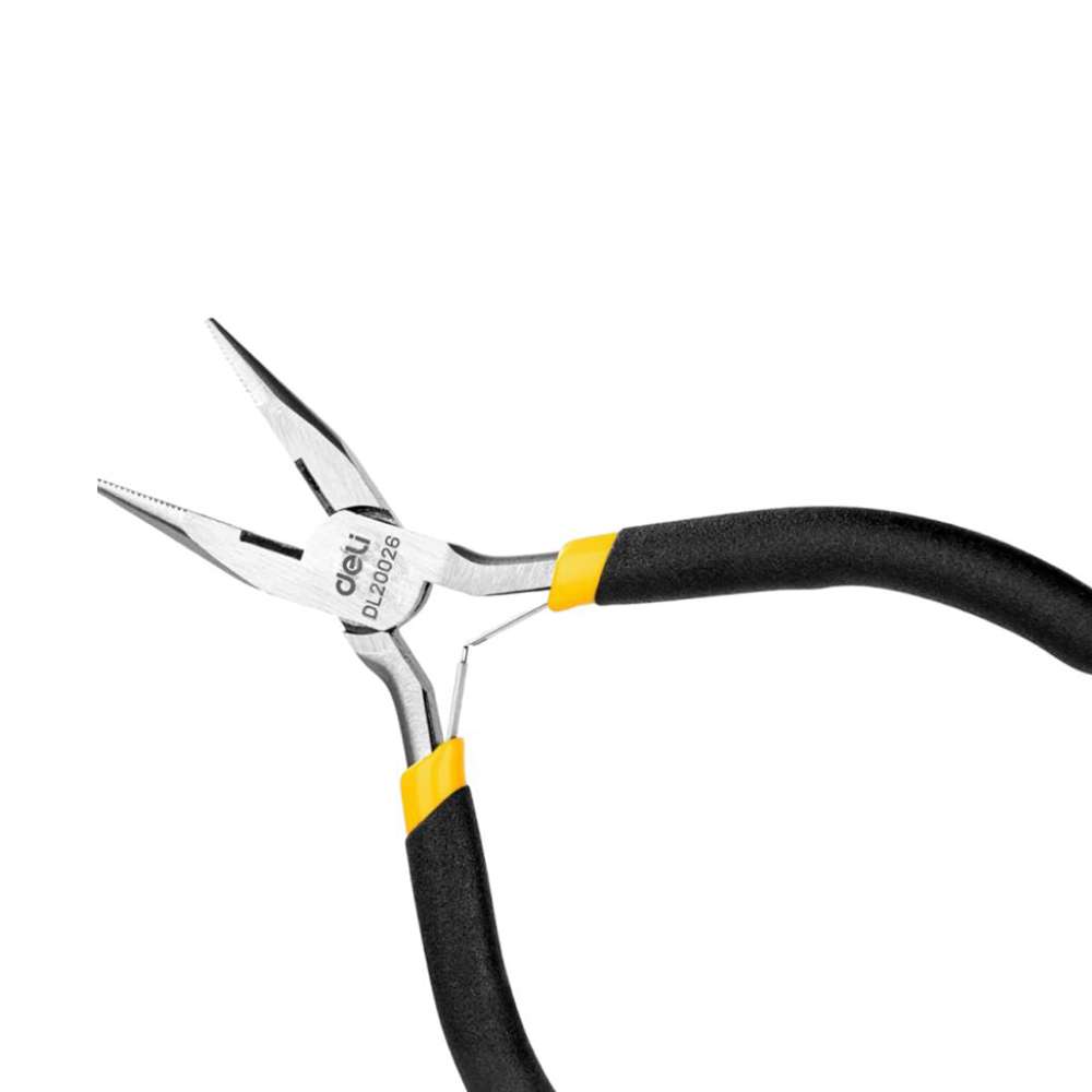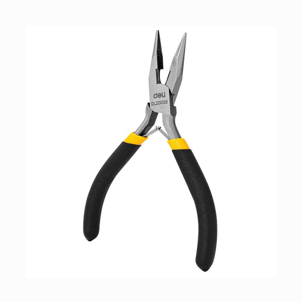 The Deli DE-EDL20026 mini long nose pliers 5" are small pliers for gripping and manipulating tiny components in electronics, models and fine mechanical assemblies. The slim, tapered jaws reach into restricted spaces, and serrated tips provide secure grip. Integrated cutters can handle small wires. These pliers are ideal for precision work on circuit boards and delicate assemblies.
