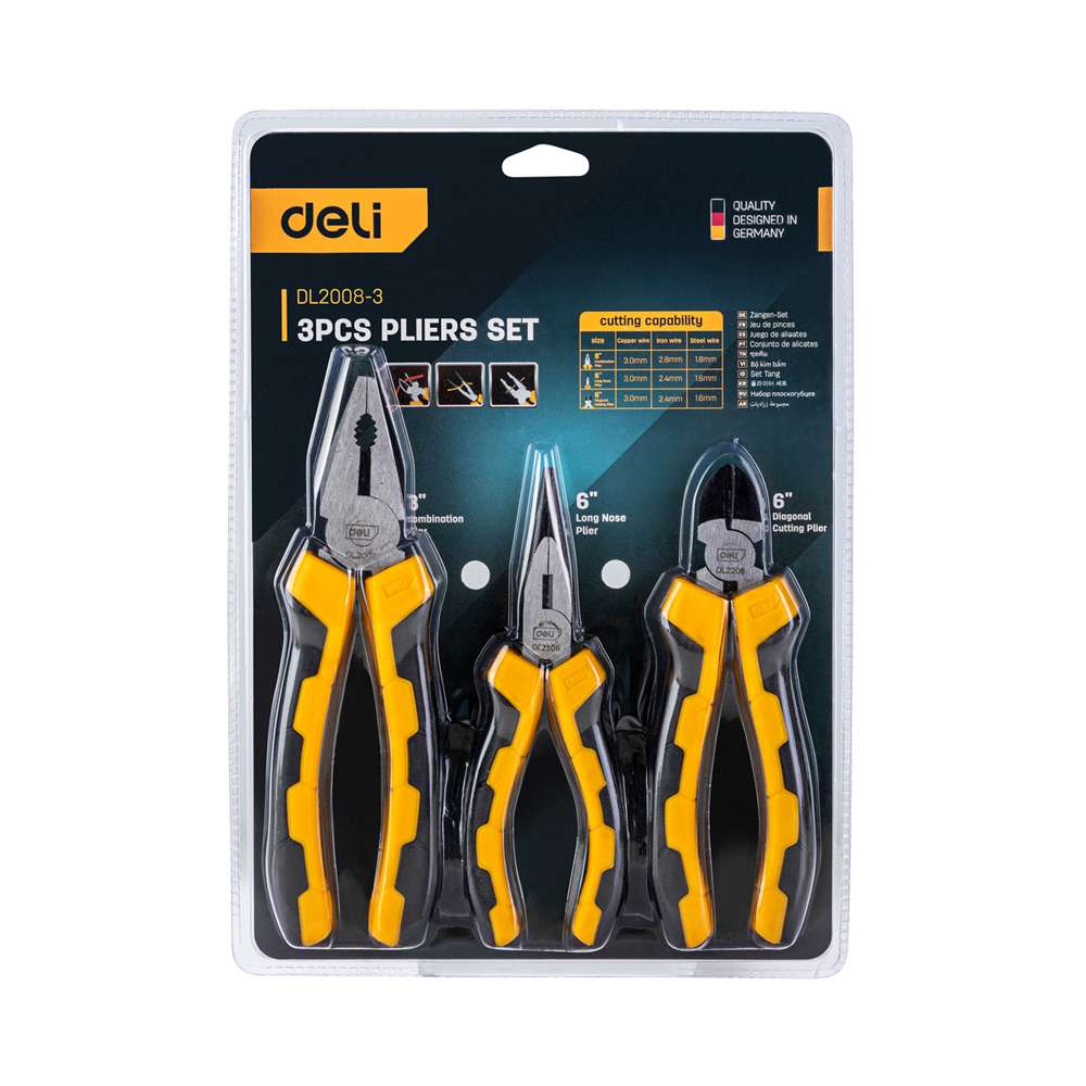 The Deli DE-EDL2008-3 pliers set 3pcs includes three essential pliers, typically combination pliers, long nose pliers and diagonal cutters, to cover gripping, holding and cutting tasks. Each tool features durable steel jaws and comfortable handles for secure grip. This set provides a versatile selection for electrical, mechanical and household work. It is ideal as a core plier kit for home and professional toolboxes.
