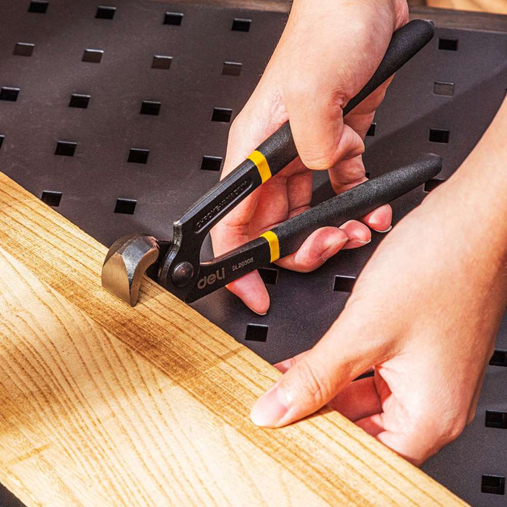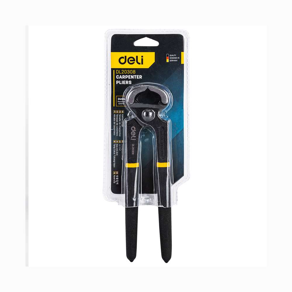 The Deli DE-EDL20308 carpenter pincers 8" are robust pincers designed for pulling nails, gripping and cutting wires. The strong jaws provide a firm grip on nail heads and allow effective extraction without excessive damage to the wood. Integrated cutting edges can handle soft wire and small nails. This tool is ideal for carpenters, joiners and general repair work.