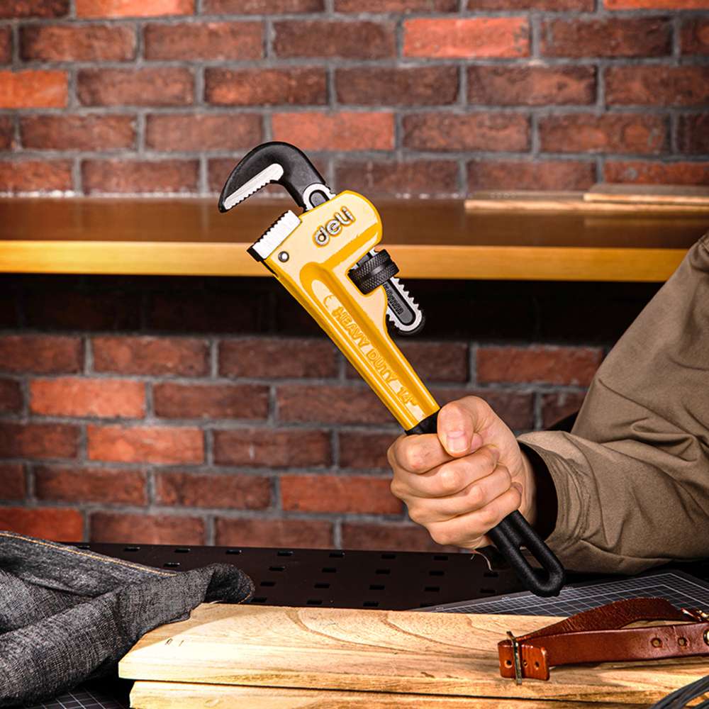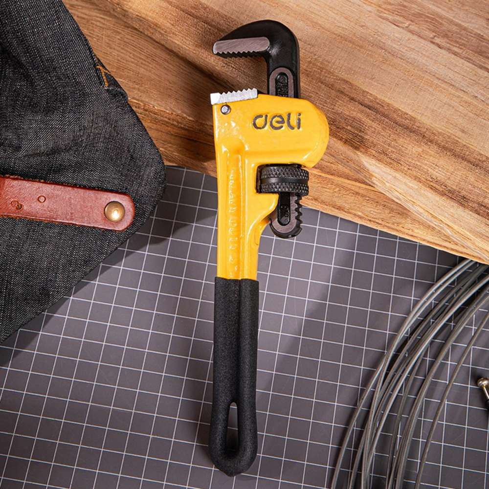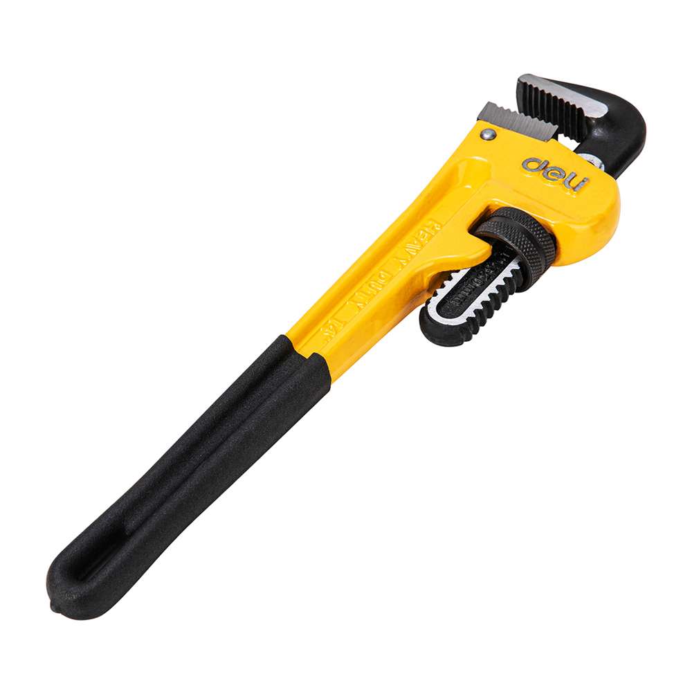 The Deli DE-EDL2514 pipe wrench 14" is a medium-size pipe wrench designed for standard plumbing and pipefitting tasks. Its adjustable jaws grip a variety of pipe diameters, while the toothed design increases grip as pressure is applied. The 14-inch handle offers good leverage for tightening and loosening connections. This wrench is ideal for residential and light commercial plumbing work.