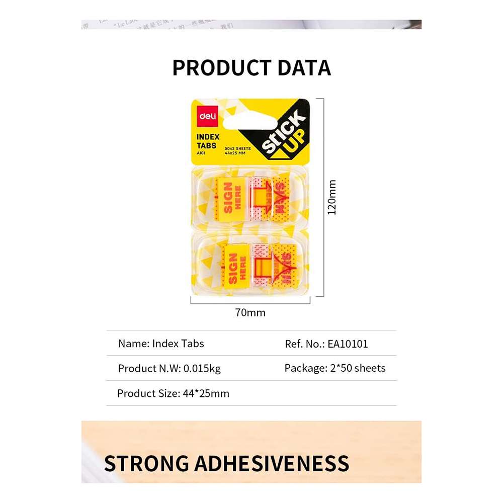 Deli provides practical index tabs for school, office, and personal organisation. The model EA10101 ensures value and consistent performance, helping users with reliable “Sign Here” marking.