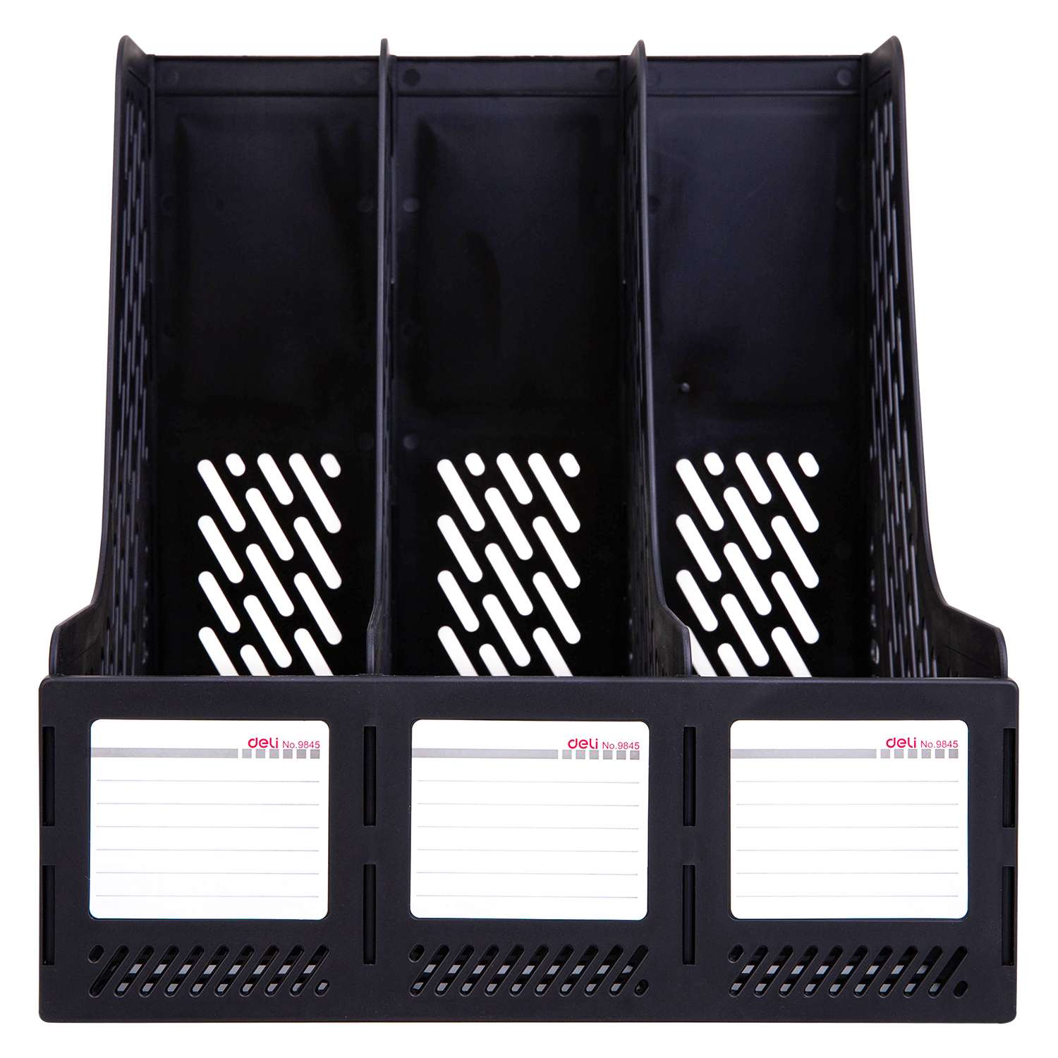 Deli organizes periodicals and files upright with a linked three-compartment rack. Model E9845 features a rigid body with finger cutouts and ventilated sides for airflow. Keep current issues visible and separated on desks, counters, or shelves in classrooms, clinics, and busy offices.