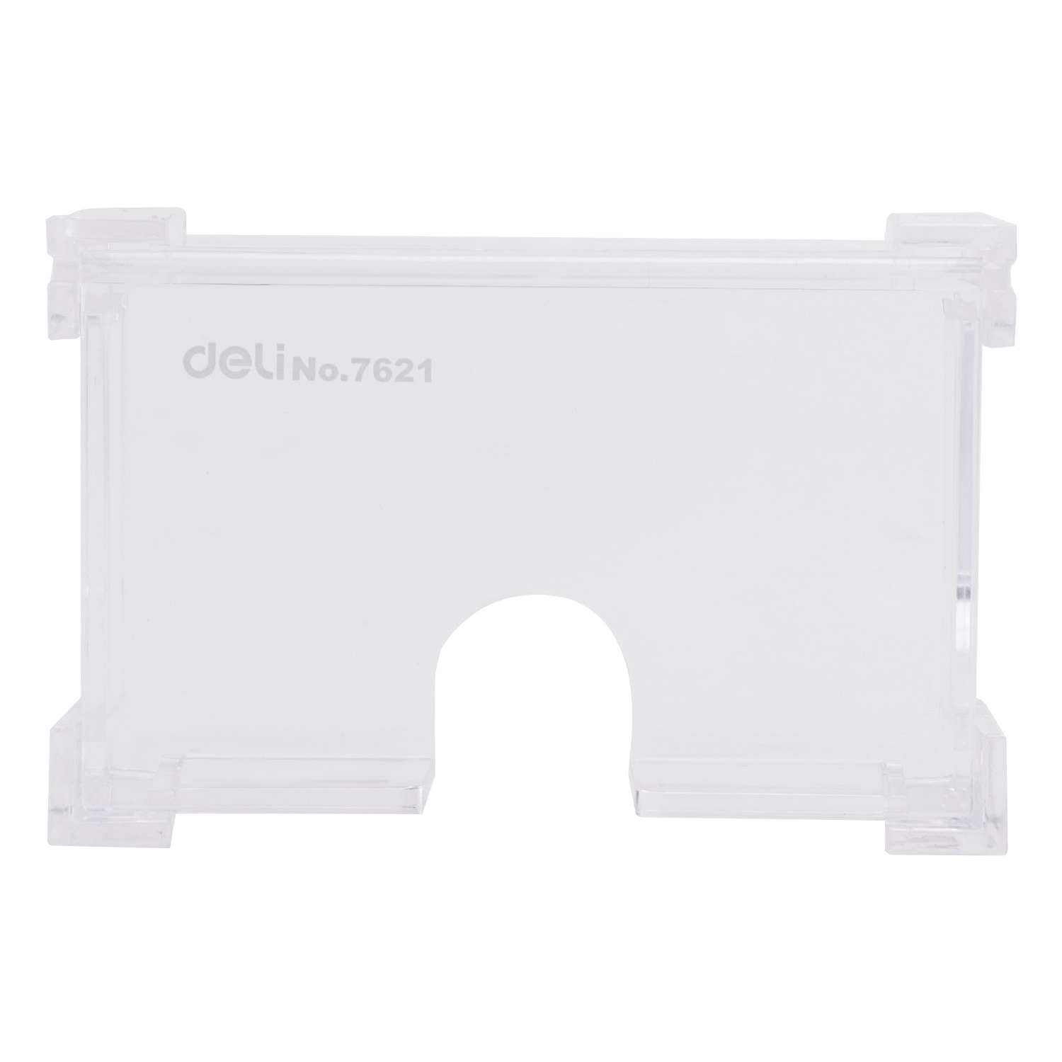 Deli keeps business cards protected and accessible at desks and on the go. Model E7621 is a transparent holder box measuring 103 × 68 × 34 mm with a secure snap closure. It prevents bending and scuffs while keeping card stacks easy to locate.