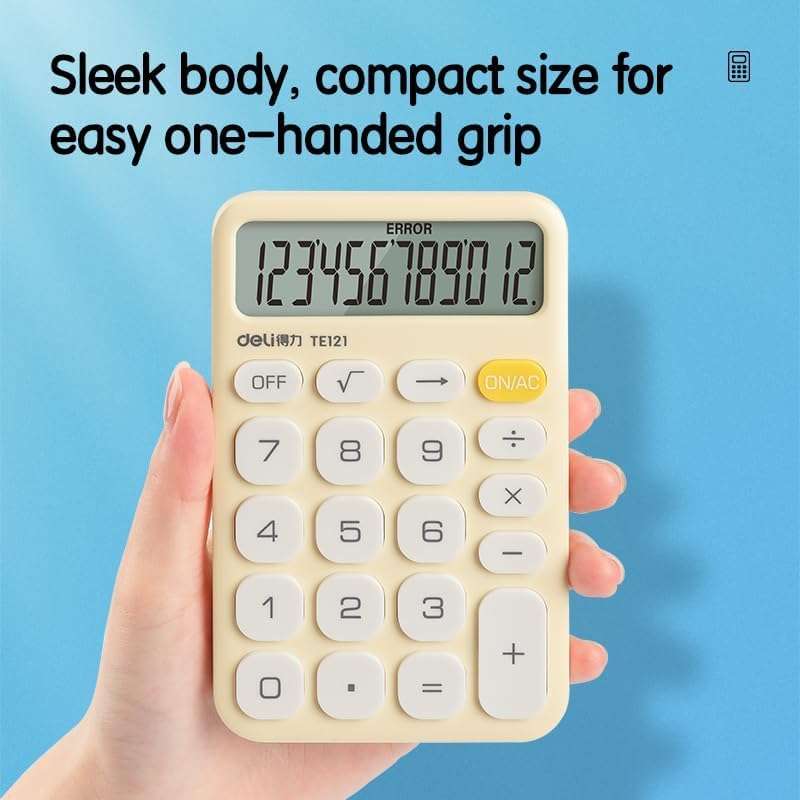 Deli provides colorful and reliable calculators for students and professionals. The TE121 model in yellow offers a 12-digit screen, durable construction, and portable size, helping users complete accurate calculations efficiently.