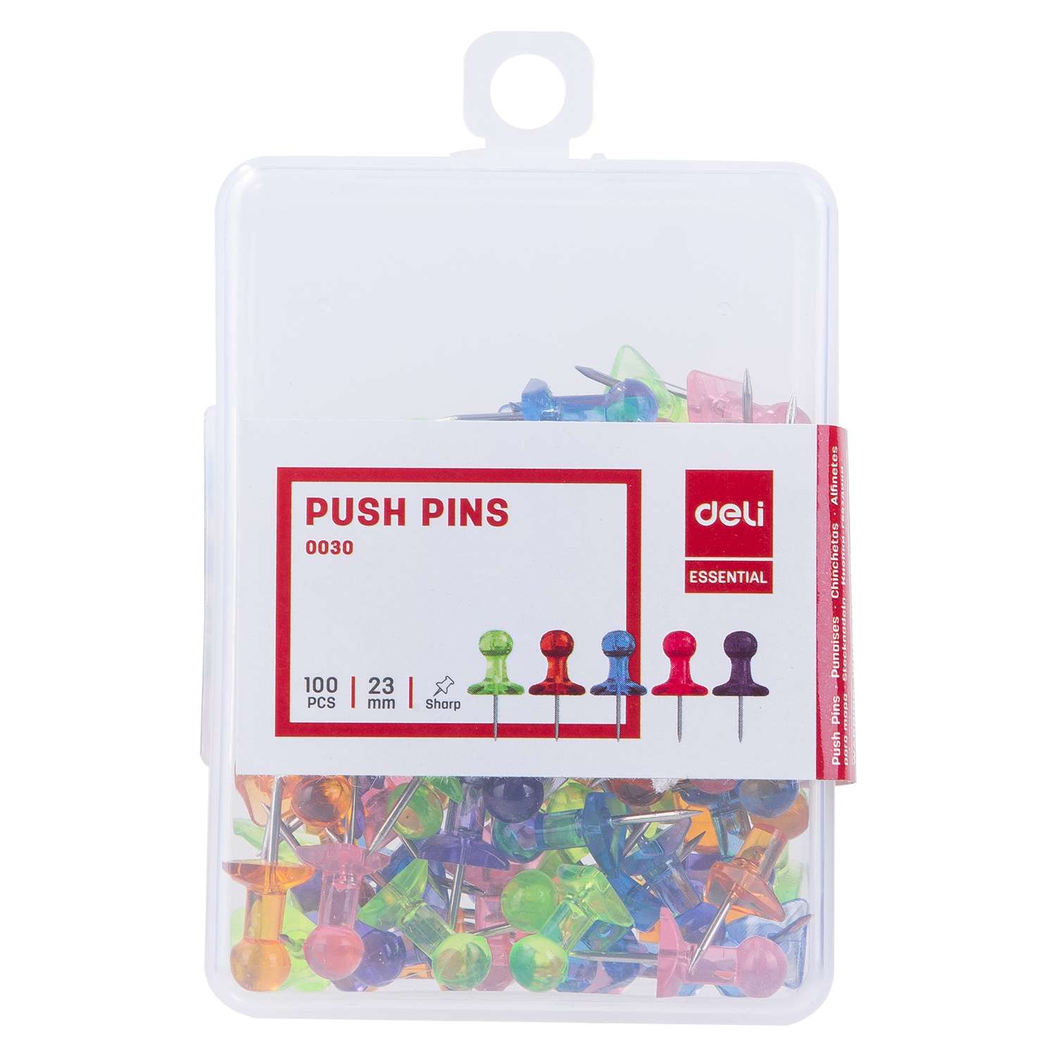 Deli transparent push pins (E0030) combine clear tinted heads with sharp steel points for neat displays. The translucent look reduces visual clutter while keeping items secure. A 100-count box equips classrooms, studios, and offices for frequent updates.