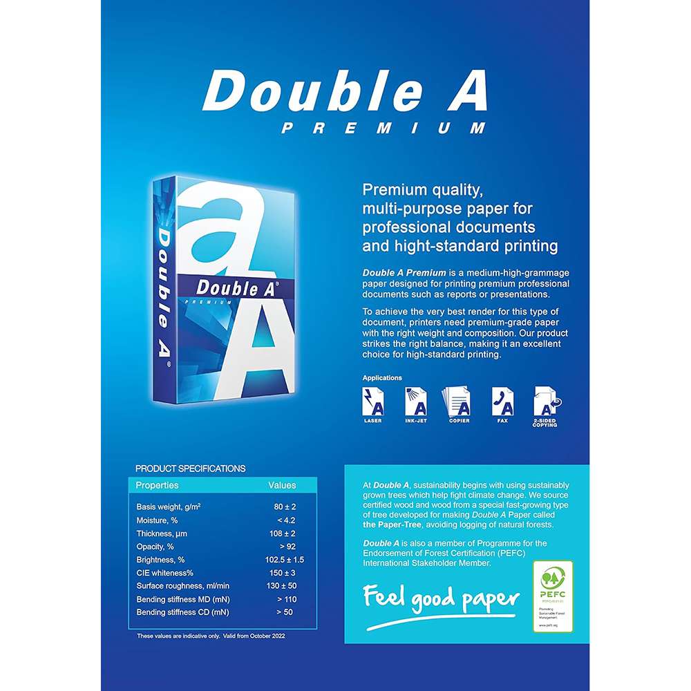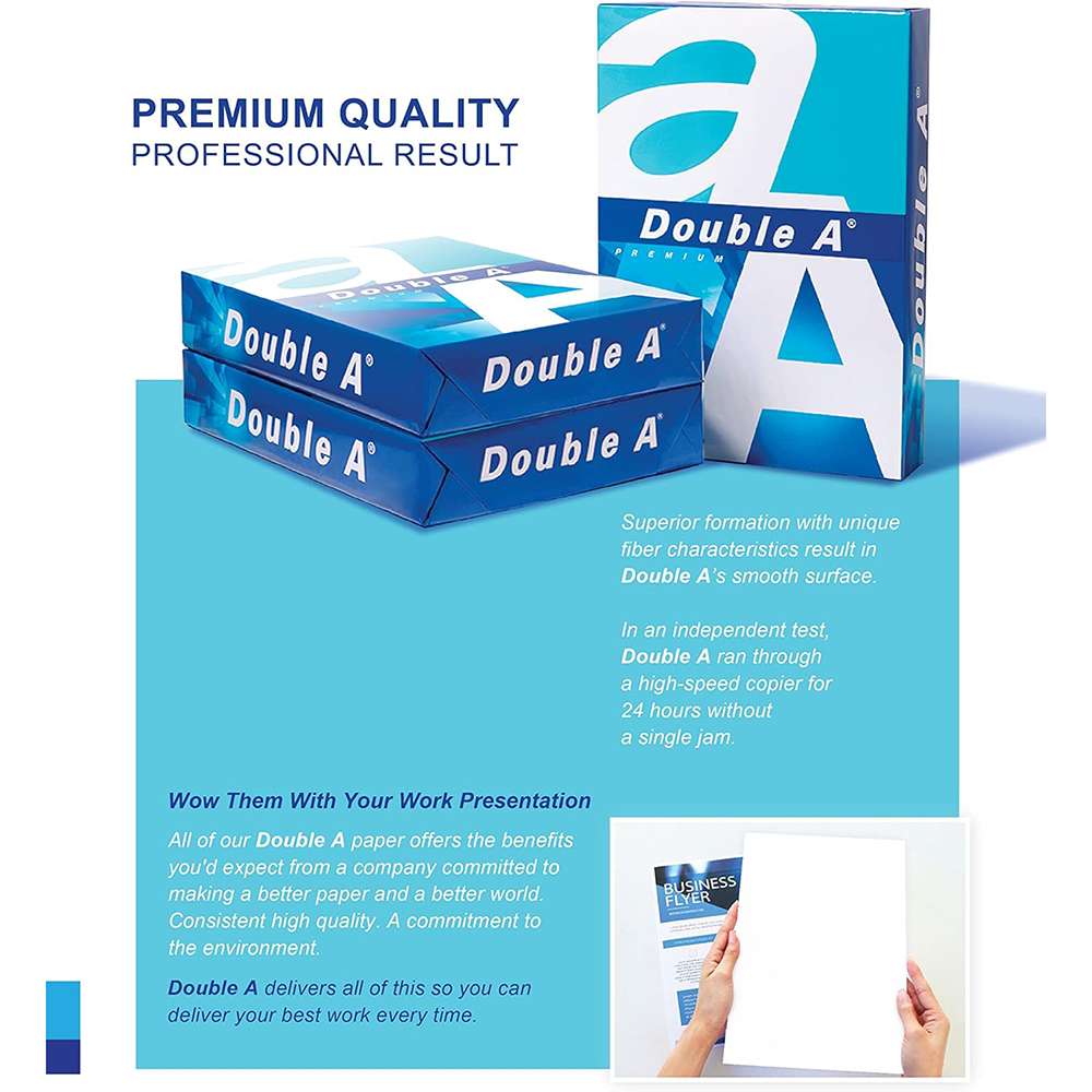 Double A provides premium A4 copy paper for offices, schools, and home printers. Optimized for reliable feeding and crisp output, 80 GSM sheets deliver bright whiteness and high opacity for two-sided documents. Smooth surface supports sharp text and graphics. Ream of 500 Sheets perfect for school and office use.