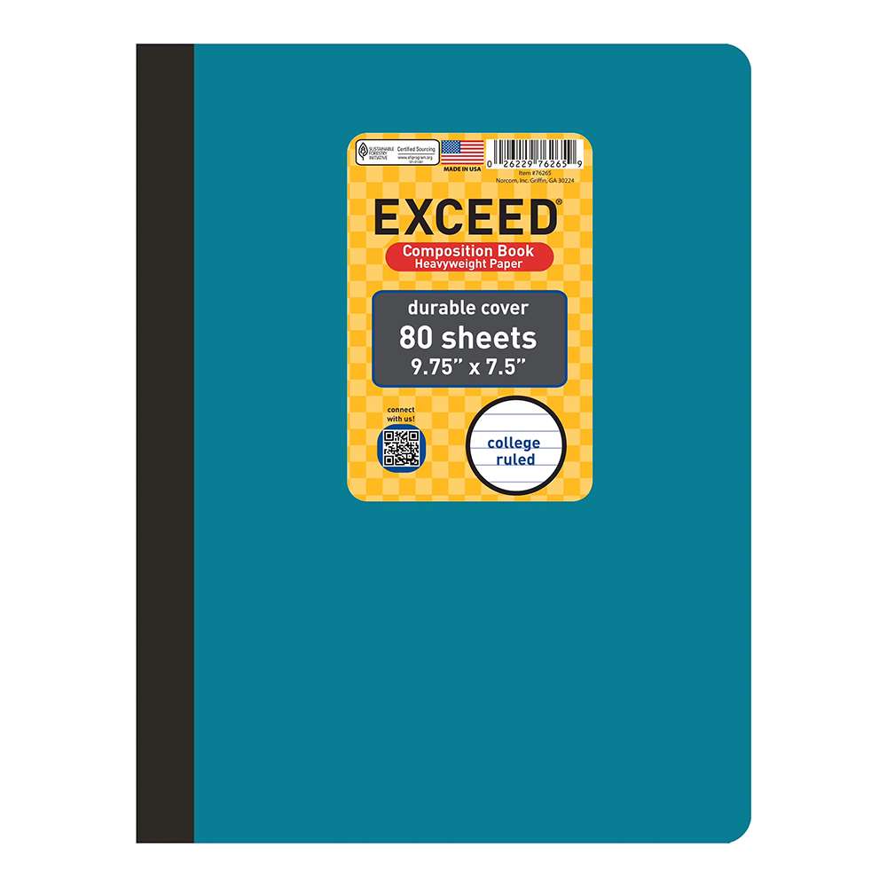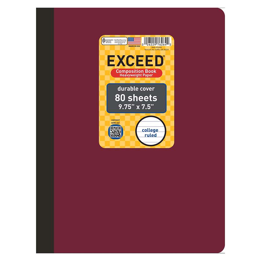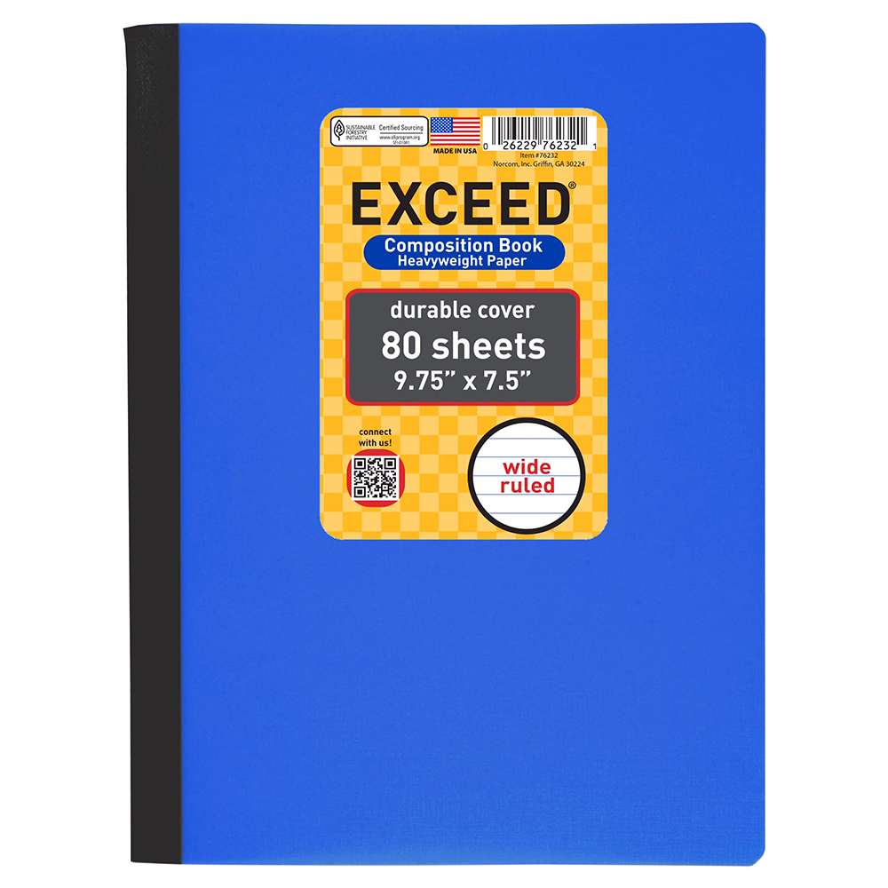 Exceed provides composition books (9.75 × 7.5 in) with smooth 75 gsm paper for school and home. The EXD-76056WNB-1 model focuses on durability (sturdy sewn binding), value, and consistent paper performance, helping users with daily writing and note-taking every day.