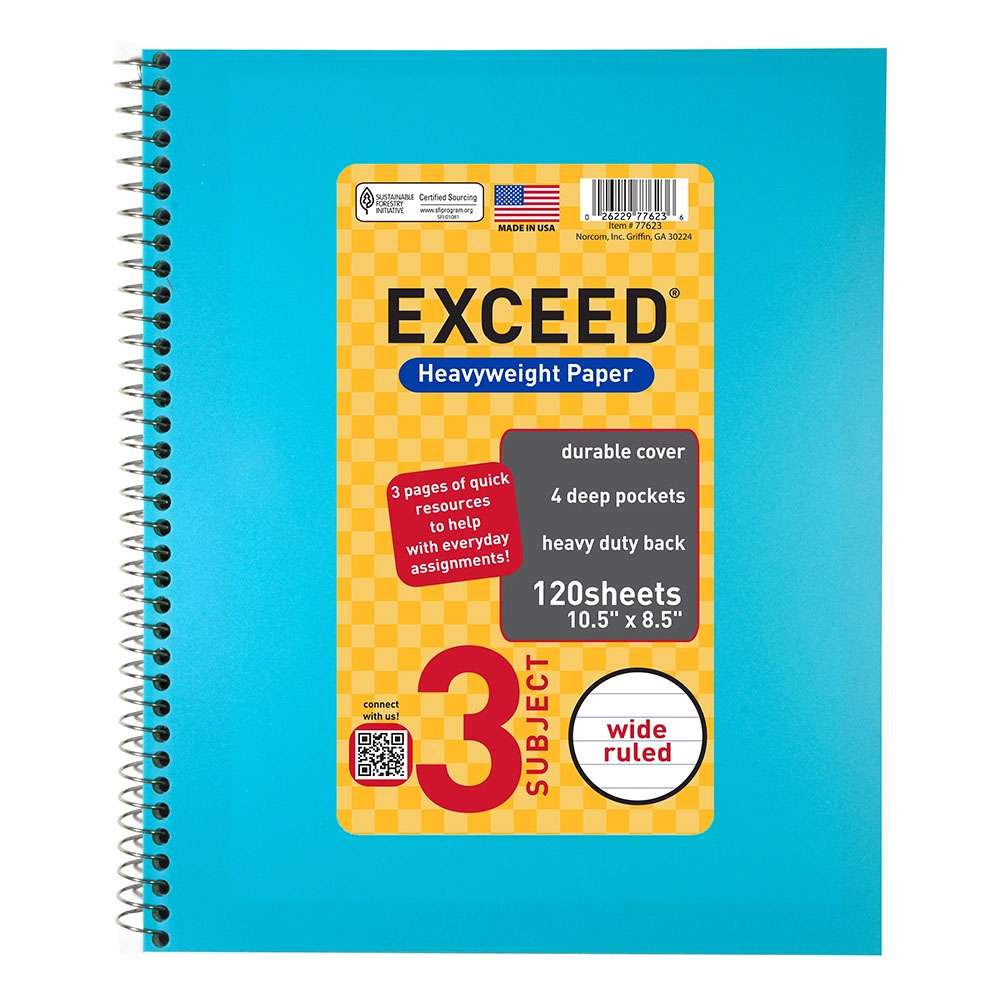 Exceed provides wirebound writing notebooks (10.5 × 8.5 in) with high-quality 75 gsm paper for school and office. The EXD-77263WNB-3 model focuses on reliability, smooth page turning, and wide-ruled clarity, helping users with structured class notes and meeting minutes every day.