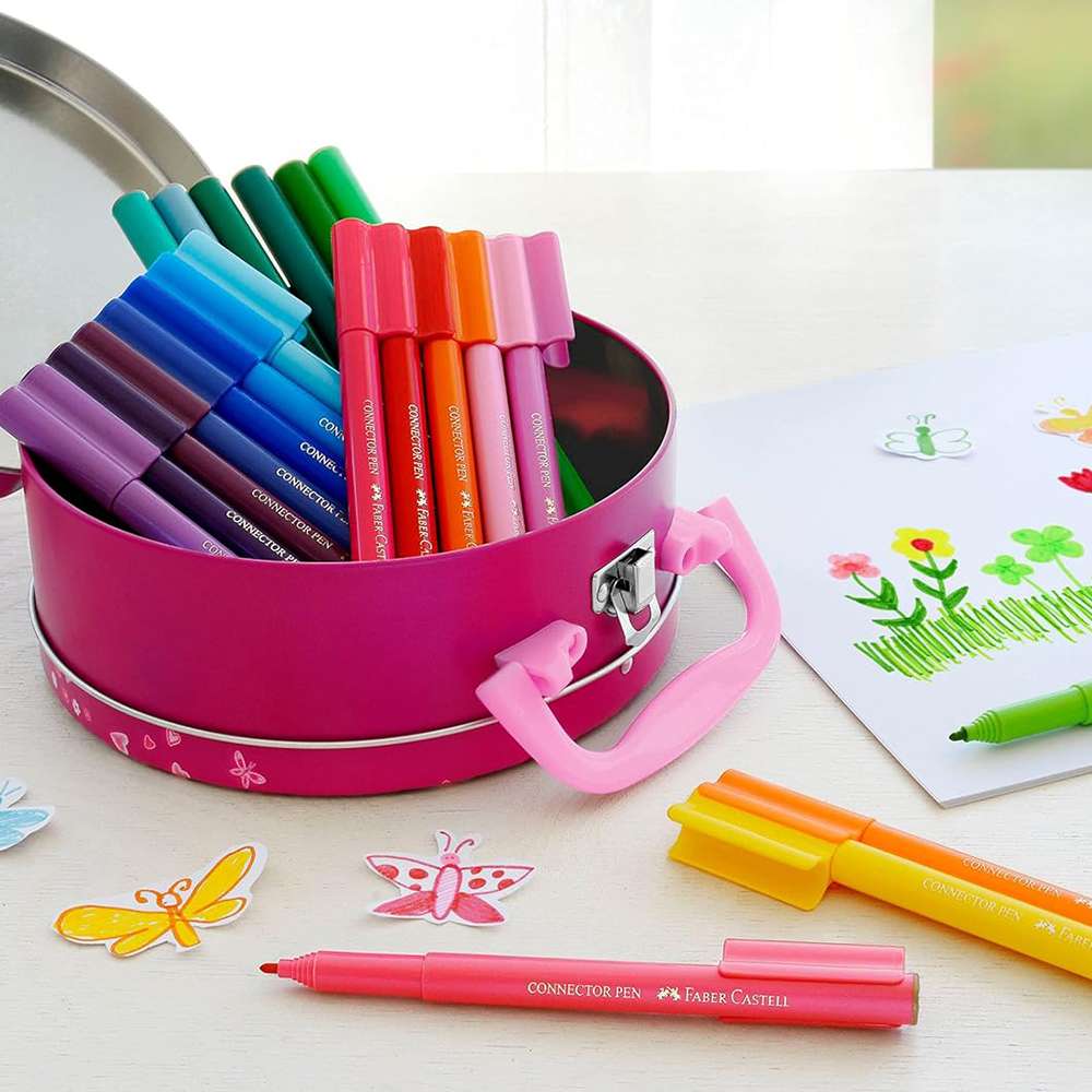 Faber-Castell provides a handbag-shaped metal tin filled with Connector pens for portable creativity. The focus is on reliability, washable inks, and buildable caps, helping kids draw, clip, and carry easily daily. Model FCI155537 contains 33 colours and connector clips.