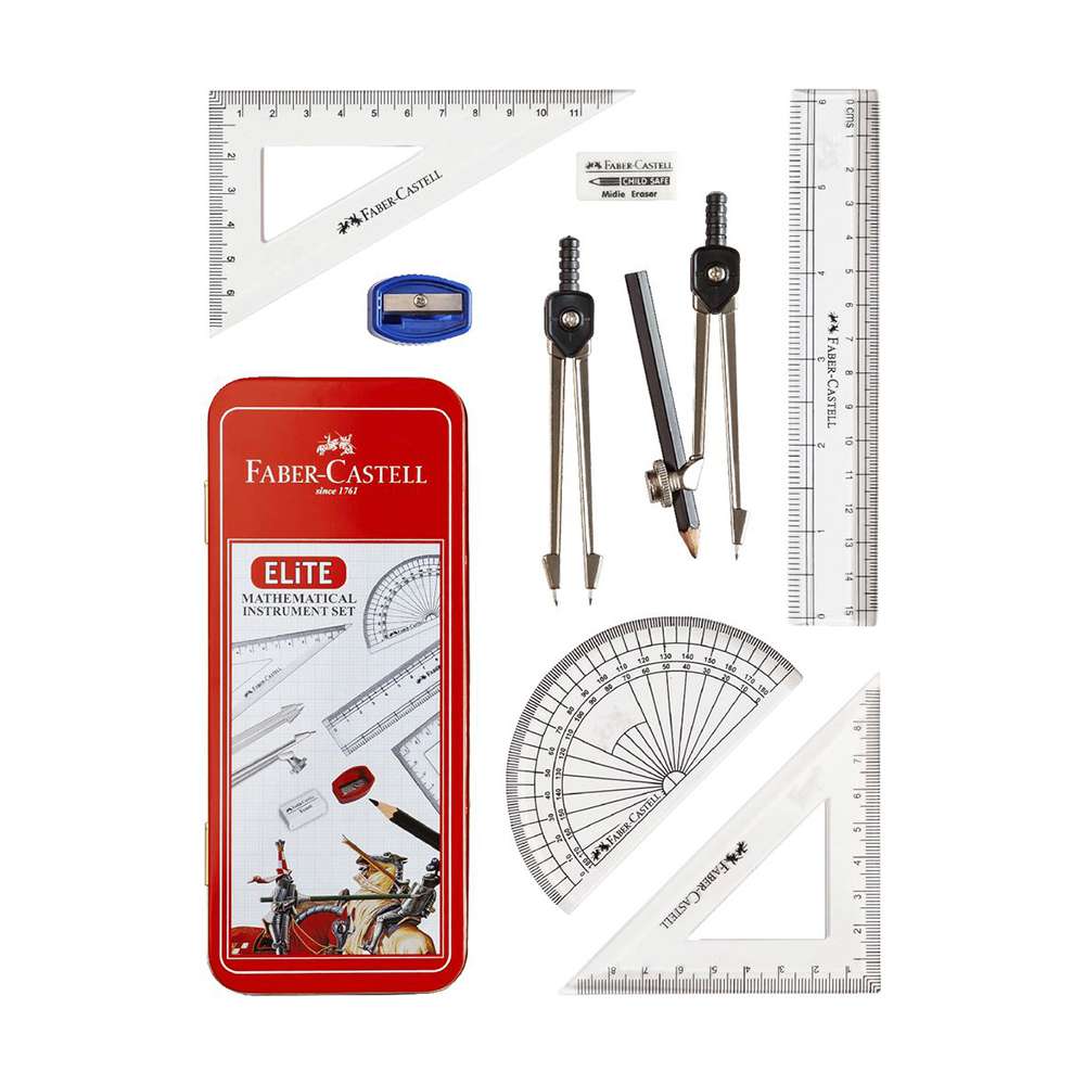 Faber-Castell provides student-ready geometry sets for school, tuition classes, and exams. The focus is on reliability, durable metal compasses, and clear scales, helping learners draw accurate arcs, angles, and constructions daily. Model FCIN163720 (Elite) includes compass, divider, ruler, set squares, protractor, pencil, sharpener, and eraser.