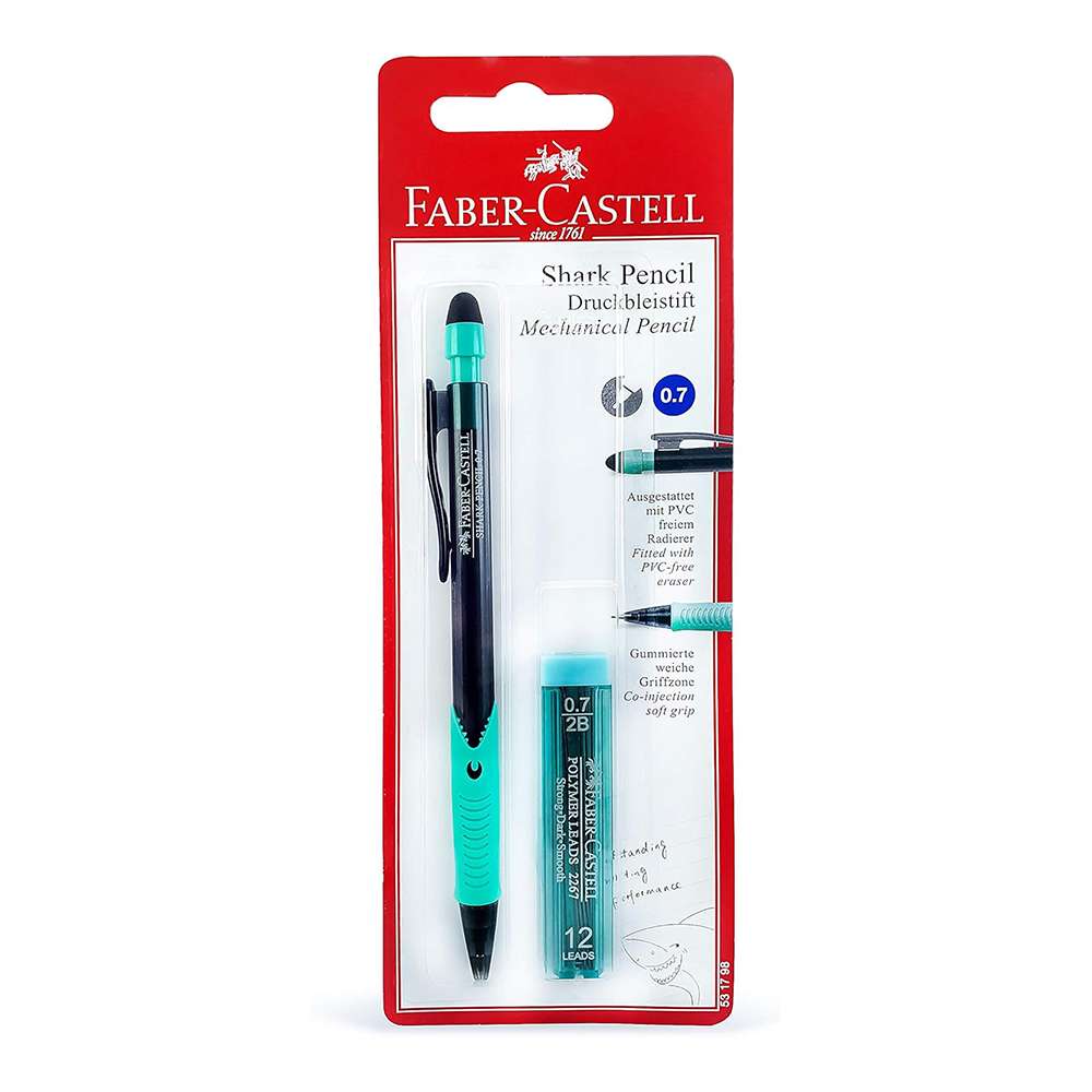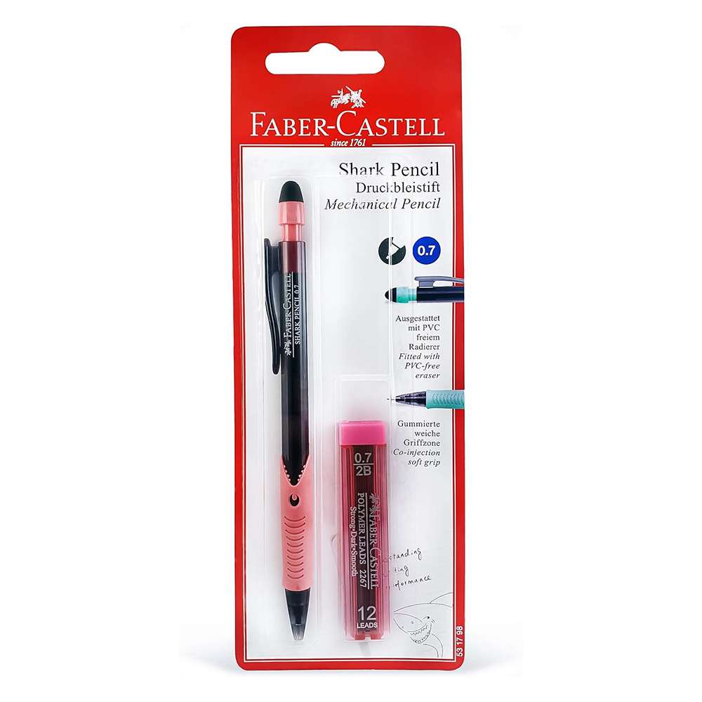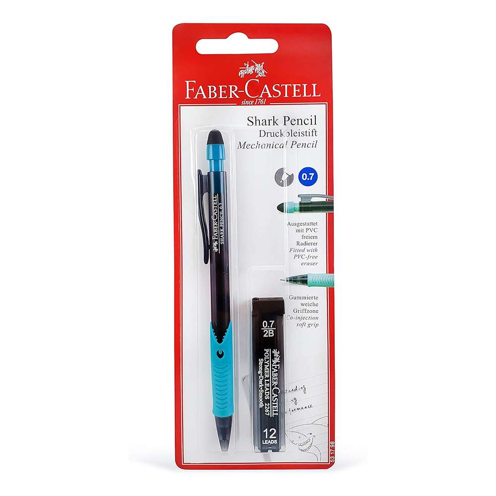 Faber-Castell provides single-pencil Shark blisters for school, travel, and home. The focus is on reliability, click-free writing, and included refills, helping users write smoothly and replace leads easily. Model FCC531798 supplies one 0.7 mm pencil plus a 12-lead tube.