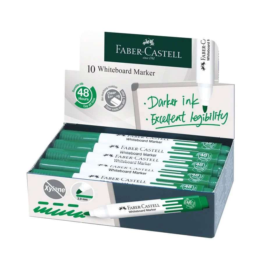 Faber-Castell provides W20 chisel green markers for status boards, approvals, and progress lanes. The focus is on reliability, flexible line widths, and dry-wipe clarity, helping users track tasks and wins every day. Model FCM253963 is engineered for frequent board work.