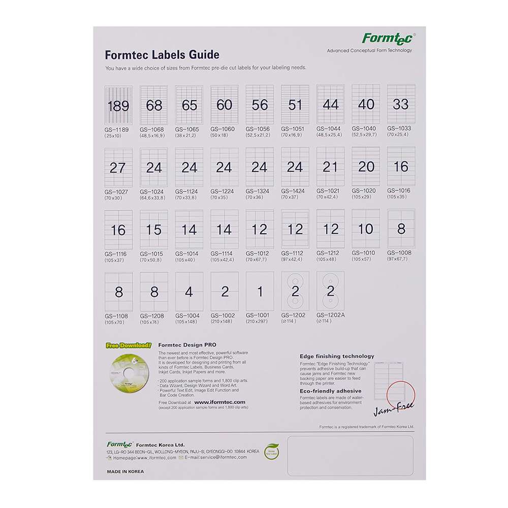The Formtec Label, model FT-GS-1065, features 6500 labels per sheet, each measuring 38x21mm. This box of 100 sheets provides a total of 650,000 labels, ideal for large-scale labeling projects. Perfect for shipping, product labeling, and inventory management, these labels are compatible with both laser and inkjet printers.