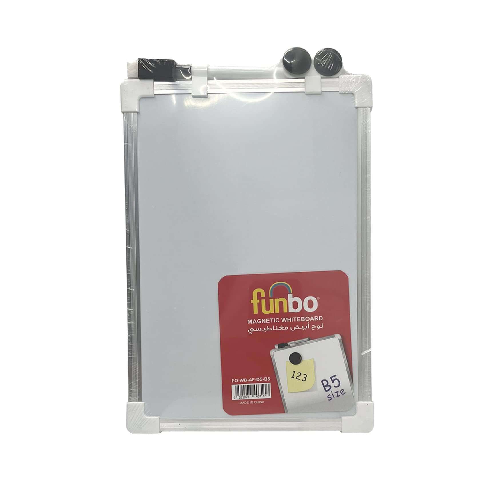 This B5 board (model FO-WB-AF-DS-B5) adds a tougher aluminium frame to Funbo’s magnetic, double-sided format. Ideal for student desktops, tutoring, and station work. Includes a marker so small-group tasks and reminders can begin instantly.