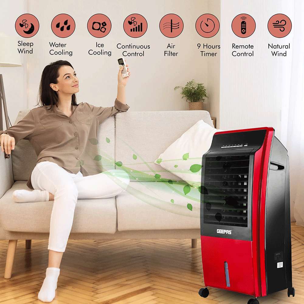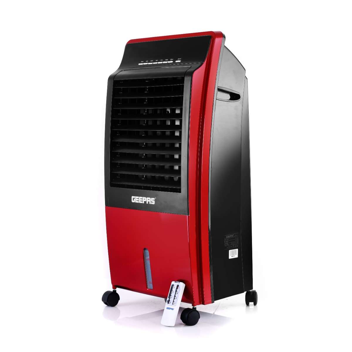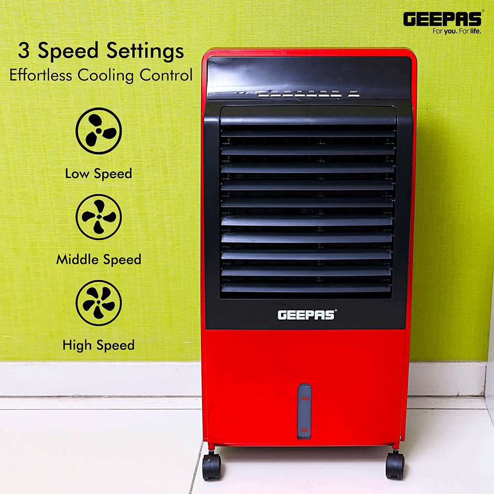 The Geepas GAC9433 air cooler and humidifier is a portable cooling unit offering 3 modes (normal, natural and sleep) with indicator lights and auto horizontal swing. It circulates cool, moist air using water and ice packs instead of refrigerant gases, making it an energy-saving alternative to air conditioners. The swing function distributes air evenly across the room. This air cooler is ideal for hot, dry climates and rooms where full air conditioning is not required.