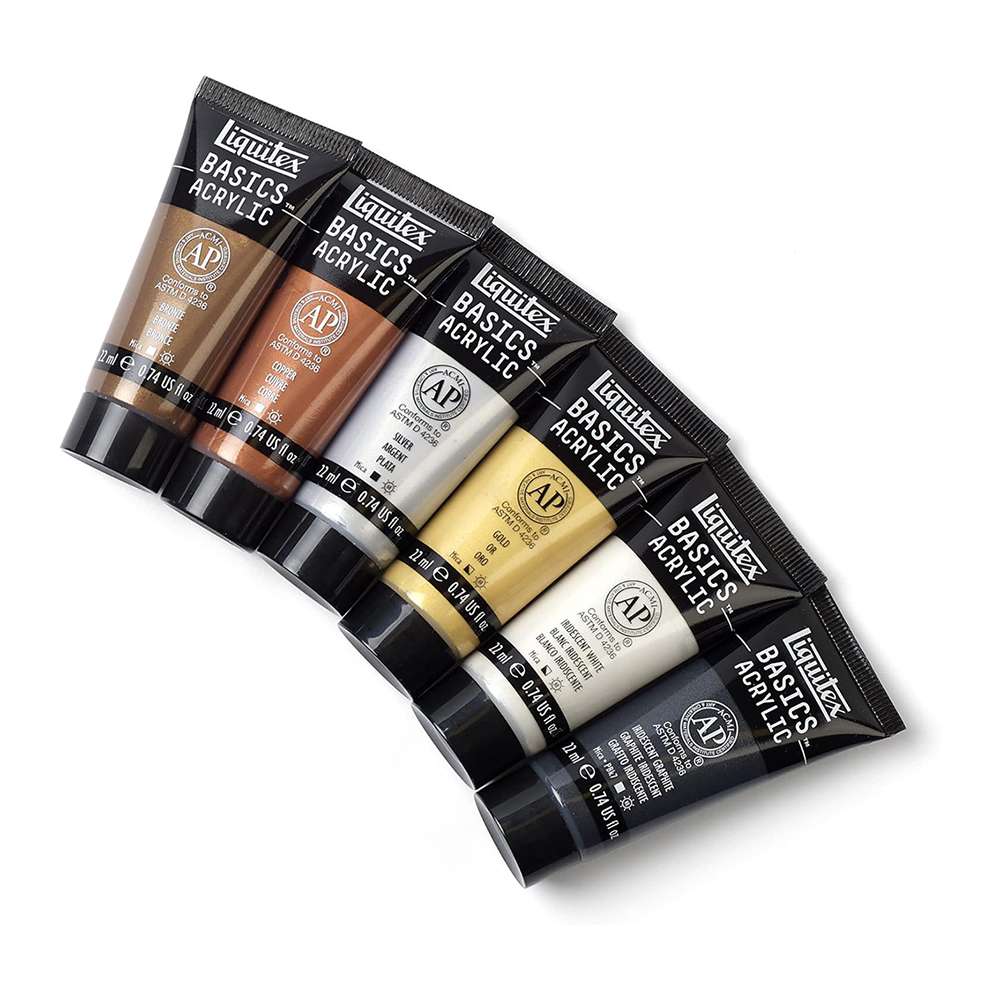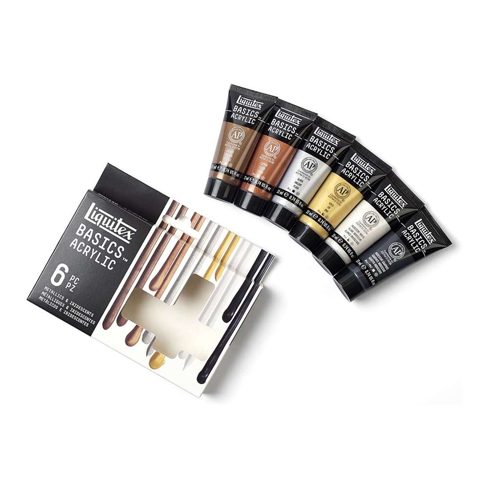 Liquitex provides BASICS effect sets for craft, décor, and highlight work. The 6 × 22 ml metallic/iridescent set offers reflective accents with classroom-easy handling. Model LX-3699399 supports lettering, frames, and special-effect layers.