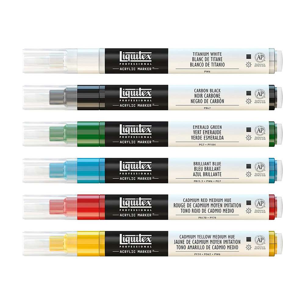 Six fine-tip acrylic markers for precise linework. The focus is on permanent color, lightfastness, and smooth output, helping artists letter, outline, and shade accurately on primed or porous grounds. Model LX-4690002 complements wide marker sets.