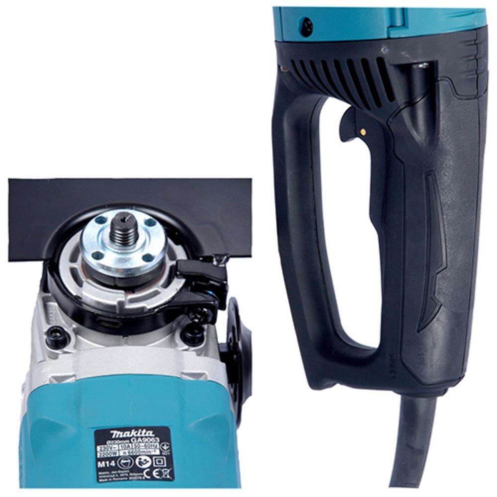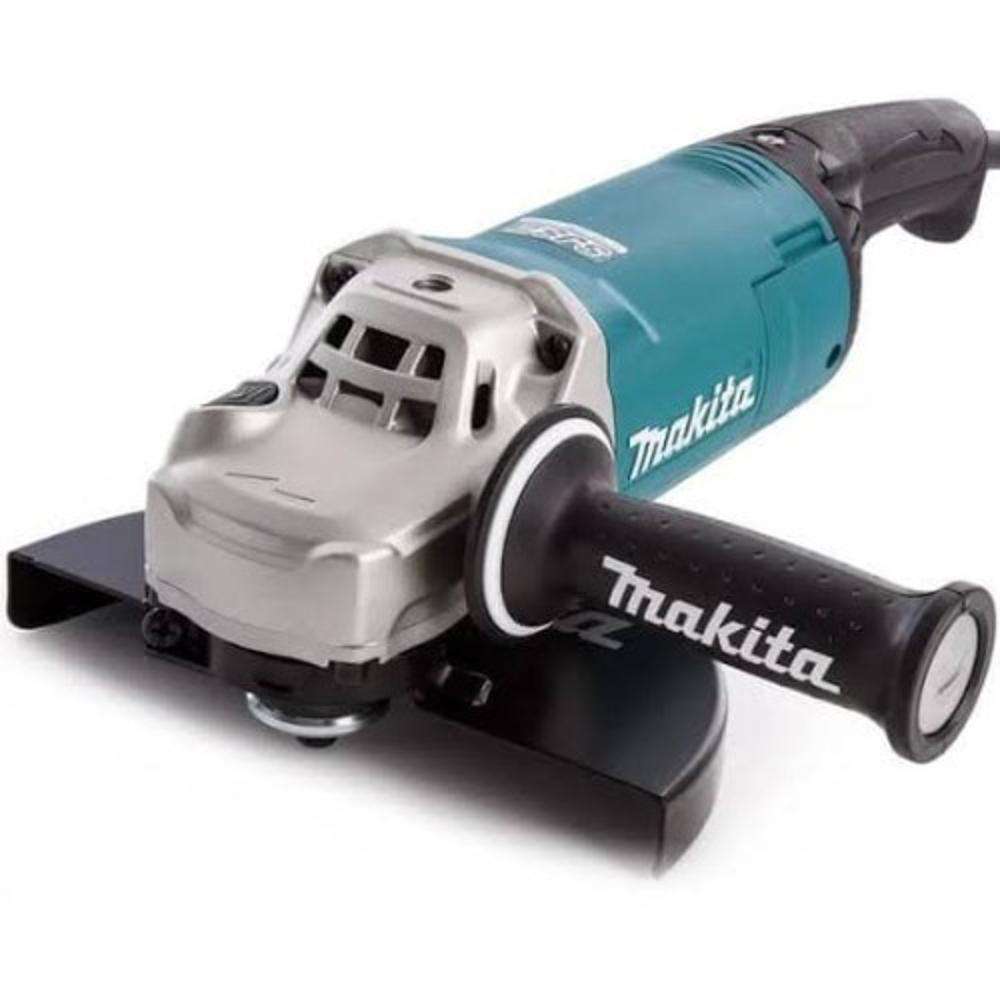The Makita GA9063 9" 2200W Angle Grinder features a 2200W motor for powerful performance in heavy-duty applications. Its 9" wheel allows for efficient cutting and grinding of metal and concrete. The dust-resistant motor ensures long-lasting durability even in tough work environments. Designed with an ergonomic, rubberized handle, it provides excellent comfort and control. The safety features include a quick-lock switch to prevent accidental starts and a large protective cover for enhanced safety. Ideal for industrial and construction tasks.