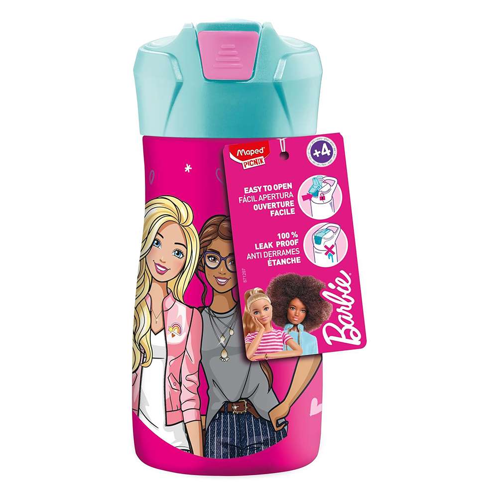 The Maped Stainless Steel Water Bottle, model MD-871297, showcases a vibrant Barbie design in a sturdy stainless steel build. The 430 ml capacity is perfect for daily hydration in school or on trips.