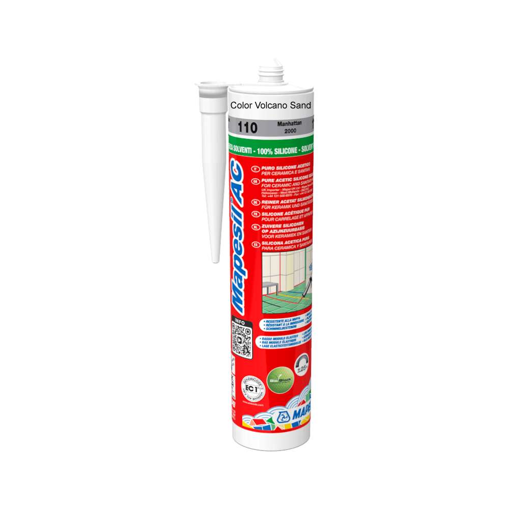 This 310 ml cartridge of Mapesil AC in Volcano Sand is an acetic-cure sanitary silicone sealant. It is designed for elastic, mould-resistant sealing of joints in bathrooms, kitchens, showers and around ceramic tiles, glass and sanitary ware, providing a durable joint colour that complements the surrounding grout and finishes.