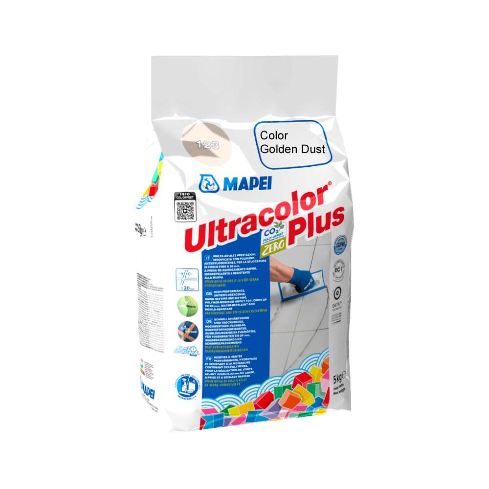 This aluminium pack of four 5 kg bags of Ultracolor Plus in Golden Dust is a fast-setting, polymer-modified grout for 2–20 mm joints. It is suitable for interior and exterior floors and walls, offering water-repellent, mould-resistant joints with a decorative joint colour that complements ceramic and porcelain tiles.