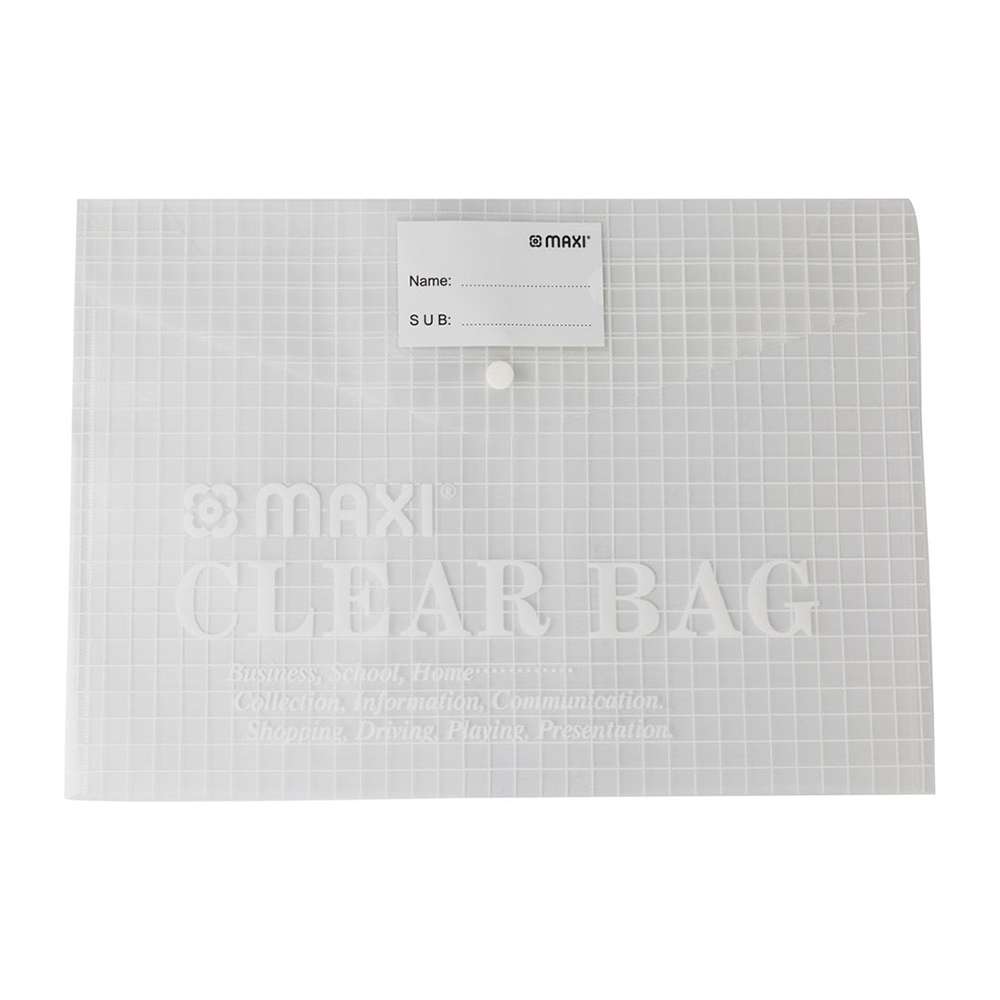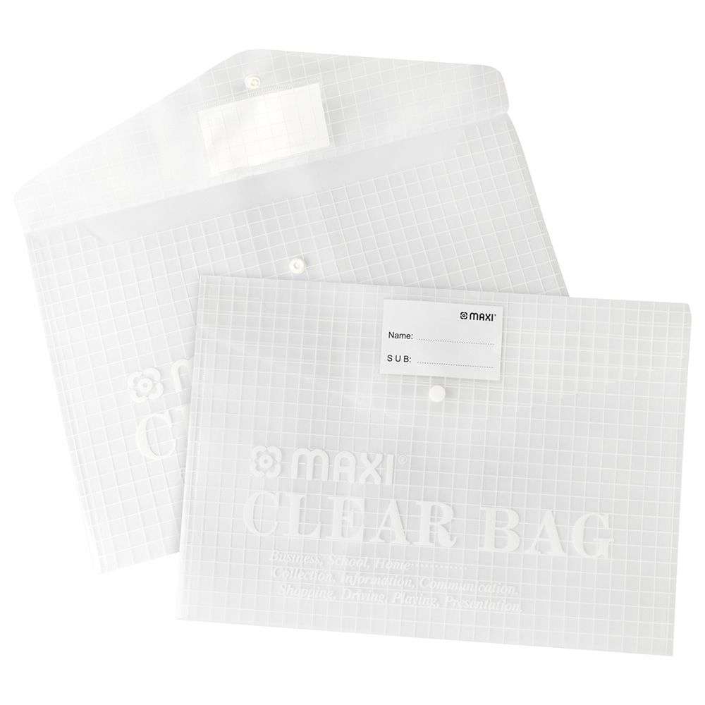MAXI provides a handy clear bag for carrying foolscap documents at school, home, and work. The focus is on durable polypropylene, a secure button closure, and an extra pocket, helping you sort receipts or notes while the MX-209C keeps paperwork visible and protected in transit.