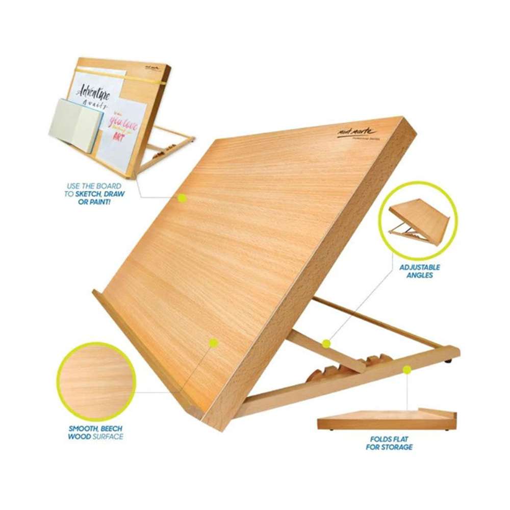 Mont Marte offers a sturdy adjustable drawing board for studio, classroom, and home use. The MEA0034 focuses on comfort, adjustability, and stability, helping artists and designers work efficiently at their preferred angles. The smooth beech wood surface is ideal for sketching, drawing and painting and comes complete with a built in pencil rest for a tidy work station. The angle adjuster and elastic band offer flexibility for different drawing methods and different scaled projects.