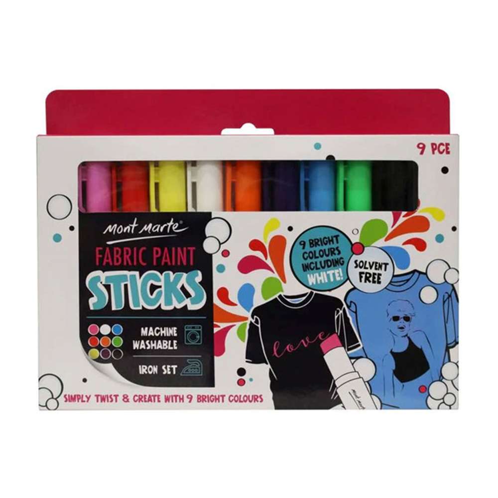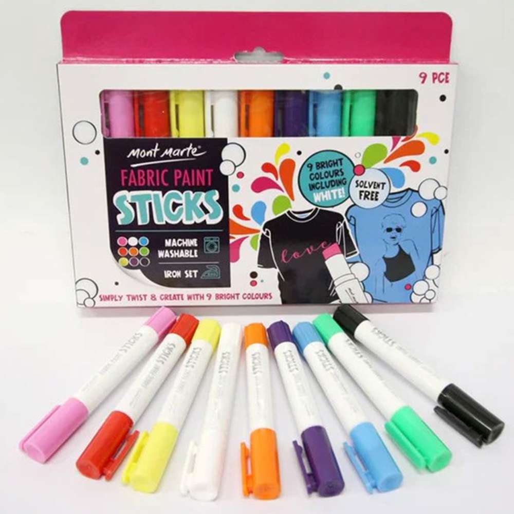 Set Includes: 9 vibrant fabric paint sticks.