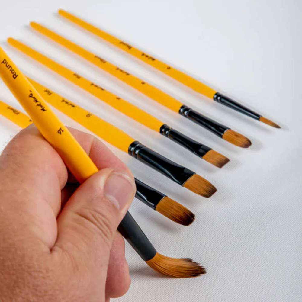 The Mont Marte Gallery Acrylic Brush Set 6pc (BMHS0017) includes high-quality round, flat, and filbert brushes, designed for versatility and precision in acrylic painting techniques.