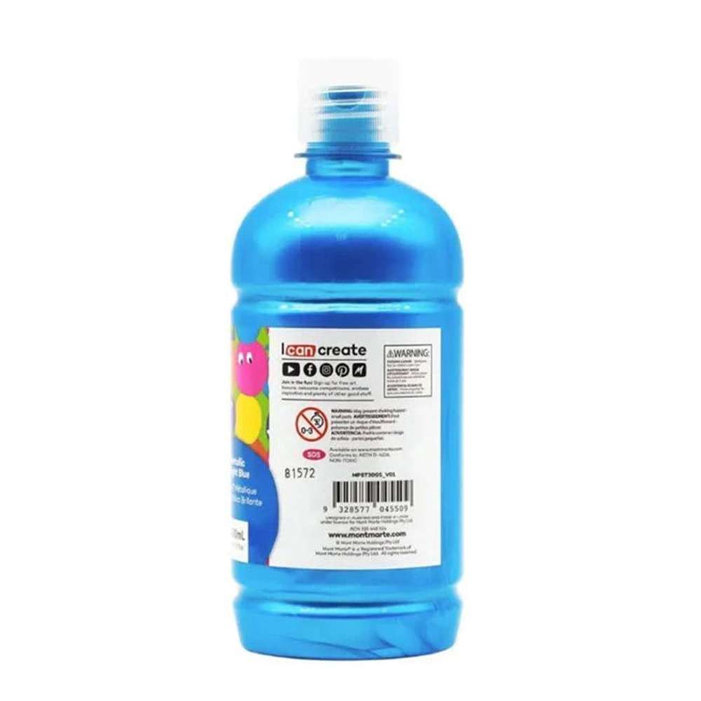 Mont Marte Metallic Bright Blue Poster Paint 500ml (MPST3005) features a brilliant metallic blue tone with glossy finish, perfect for striking visual effects in crafts and art displays.