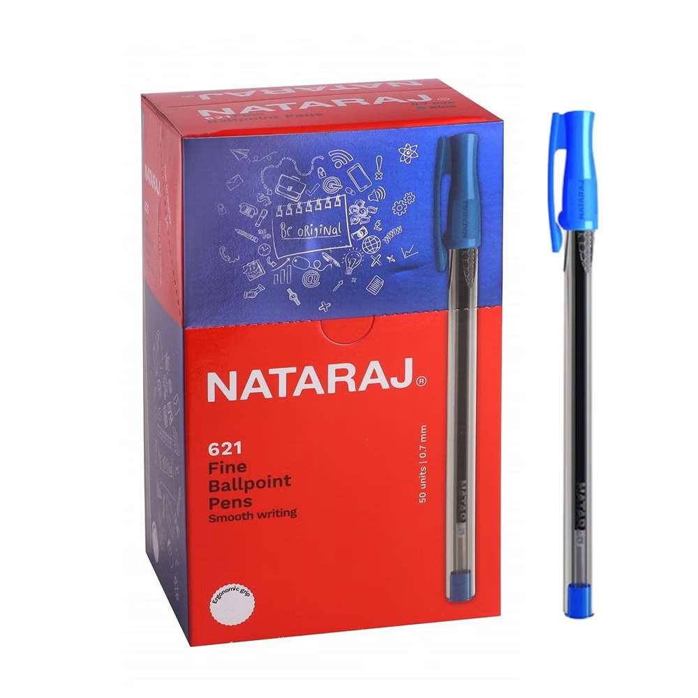 Nataraj Tririte X Triangle pens (Model HP206524103) feature a medium tip with smooth blue ink. The triangular grip design ensures comfort, while the 50-pen box offers bulk convenience.