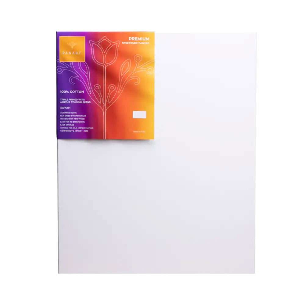 Panart Stretched Cotton Canvas (Code PAN50X60-1.5) provides a rectangular 50x60 cm surface built with 350 GSM cotton and mounted on a 38x25 mm frame. Pre-primed and sturdy, it is suitable for academic, studio, and professional work.