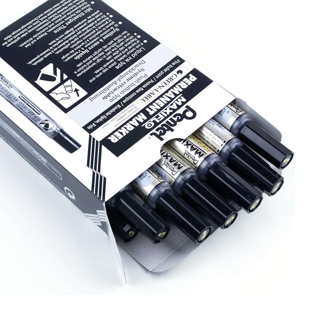 Pentel Maxiflo bullet markers (model PE-NLF50-A) use liquid ink with a push-button revival system to keep flow strong until the last drop. Low-odour, fast-dry ink marks on most surfaces, making these a dependable choice for warehouses, classrooms, and office storage.