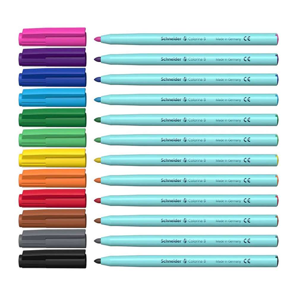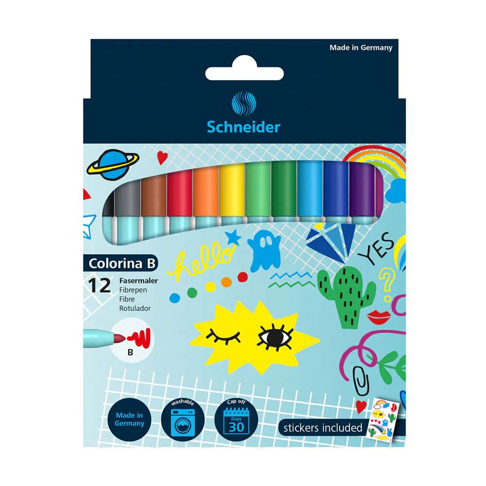 Schneider offers fun, bold coloring for school and home. Model SCH0732 (Colorina Bold, 12-color) includes bright, washable inks and durable fiber tips for posters, projects, and crafts. The compact wallet organizes colors, supporting easy selection and tidy storage between sessions.